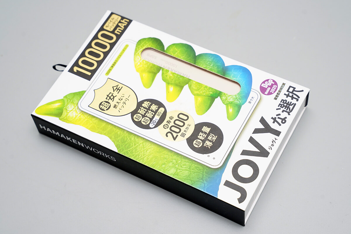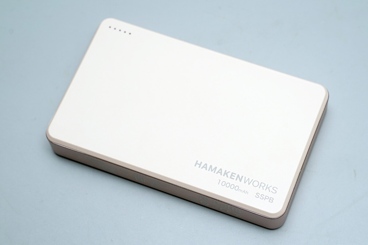 「準固体」モバイルバッテリーはHAMAKEN WORKSの「SSPB(準固体電池モバイルバッテリー) 10,000mAh」。大きさは約112×68×17mm、重さは約195g、価格は税込8,980円。動作温度範囲は−20〜80℃までです。