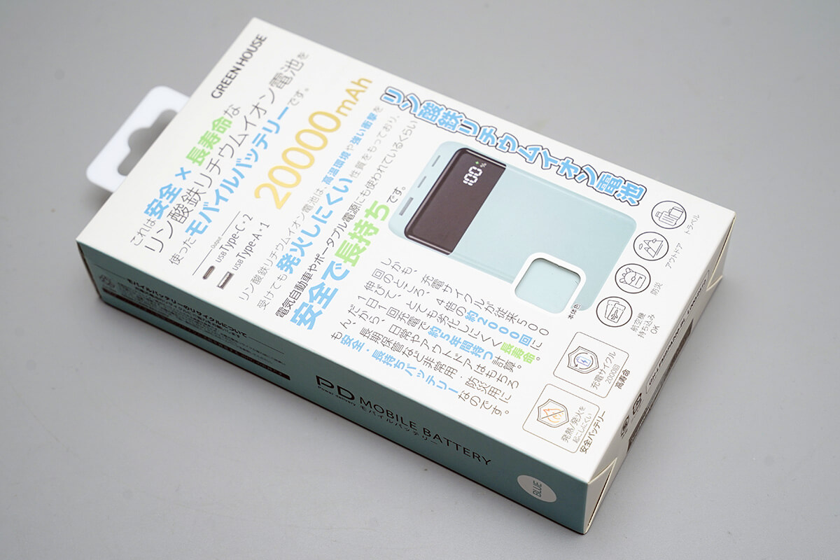 「リン酸鉄リチウム」バッテリーはグリーンハウスの「モバイルバッテリー 20000mAh リン酸鉄 GH-LFMBPA200シリーズ」を入手しました。大きさは約140×69×29mm、重さは約375g、価格は7,180円です。動作温度範囲は0〜40℃。