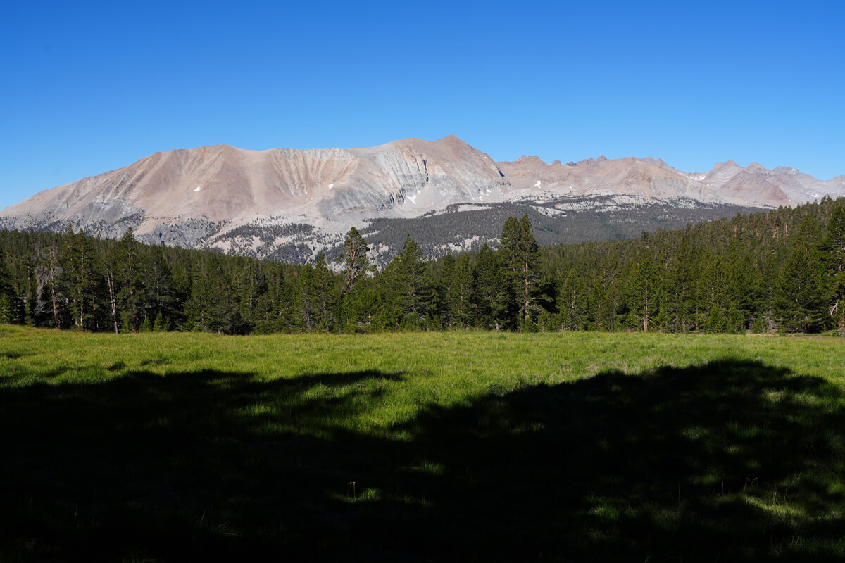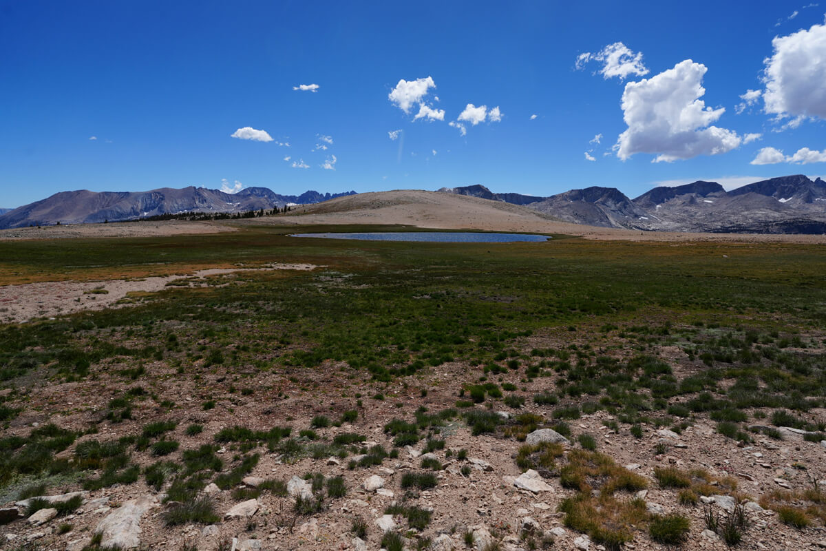 トウニー・ポイントに近づくと、トレイルは少しずつ高度を上げるが、これがなかなか身体に堪えてしまった。さて、最後のスイッチバックを登り切ると、トウニー・ポイントが見え、広い平原が現れる。ビッグホーン・プラトー (図 3.8) である。シェラ山中では特異な場所なので、アメリカのハイカーに人気の場所である。池はあるが、草の上にテントを張るのは違反だし、そもそも見通しが良すぎる。2009 年に知り合ったジョエルの息子が、トイレができない、隠れる場所がないんだと言っていた。