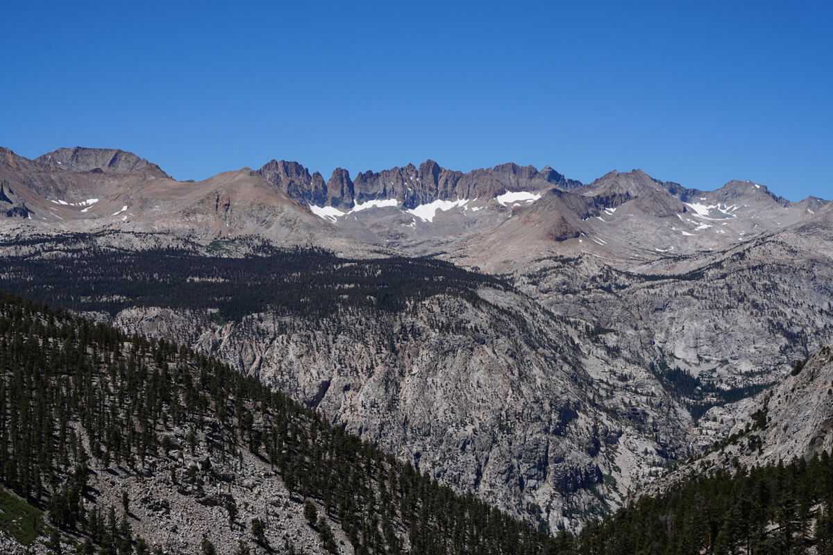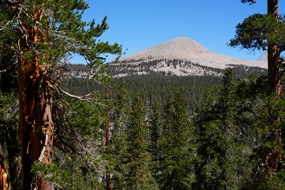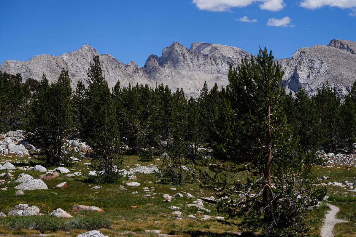 トウニー・ポイント往復は一番手軽なサイド・トリップだが、あまりやる人はいない。バックパックをデポして、ピークを往復するには 1 時間程度かかる。JMT ハイカーはゆとりが無くなっている人が多い。筆者は 3回も登ったし、今回はパスとした。それに、ビッグホーン・プラトーの景色は、中腹程度からの眺めがベストである。初めての人はせめて中腹まで登ってみた方がよい。今回はトレイルから 20mm ワイド端での撮影である。