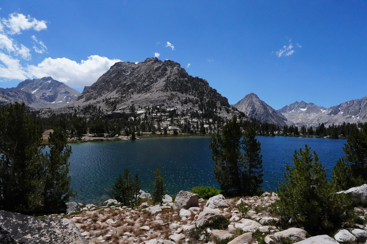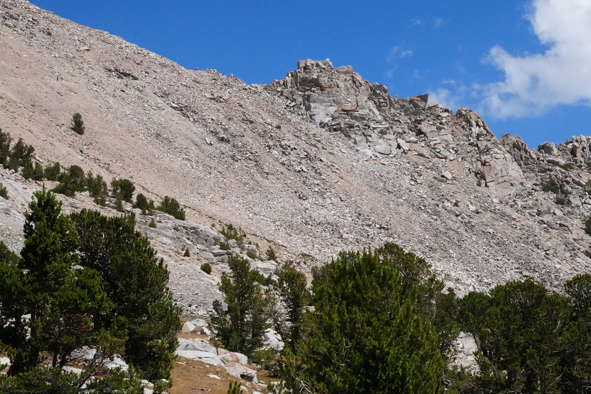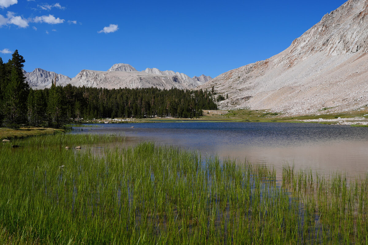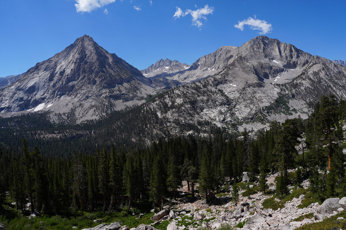 トウニー・ポイント往復は一番手軽なサイド・トリップだが、あまりやる人はいない。バックパックをデポして、ピークを往復するには 1 時間程度かかる。JMT ハイカーはゆとりが無くなっている人が多い。筆者は 3回も登ったし、今回はパスとした。それに、ビッグホーン・プラトーの景色は、中腹程度からの眺めがベストである。初めての人はせめて中腹まで登ってみた方がよい。今回はトレイルから 20mm ワイド端での撮影である。