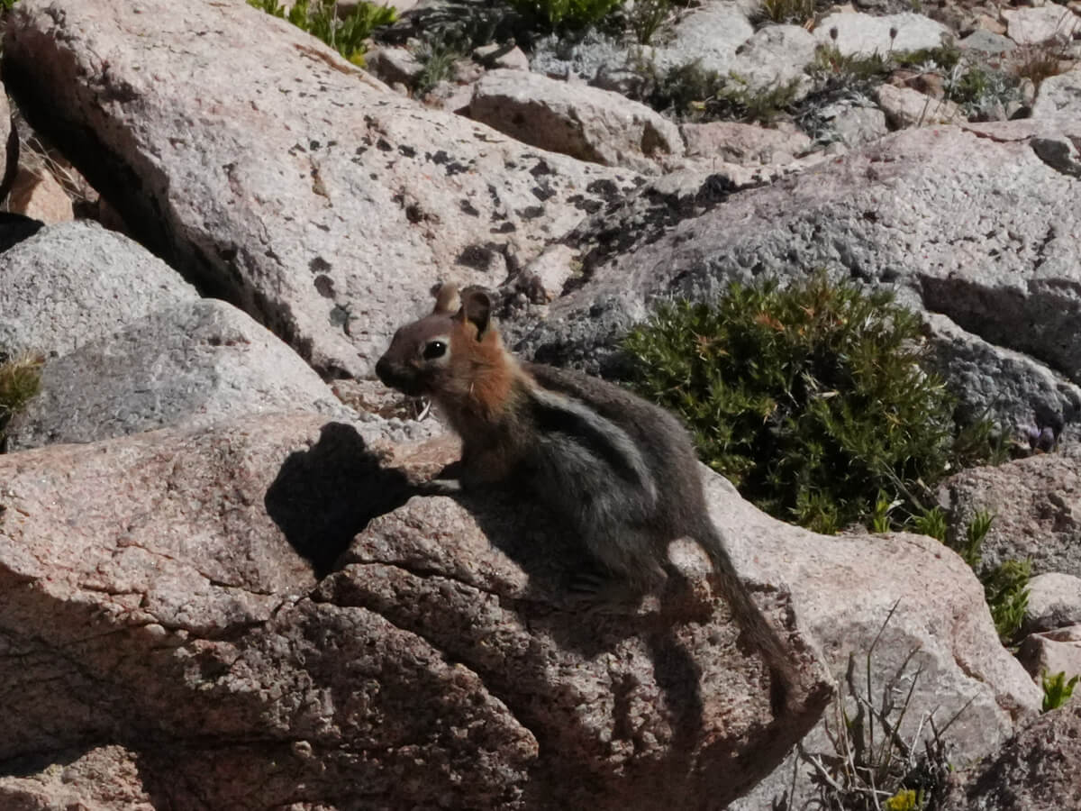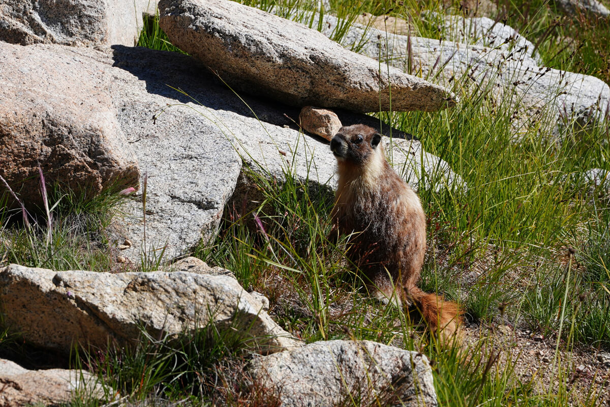 この辺りにはマーモットが多いのだが、ズームの望遠端が 70mm なので、写真を撮るのが難しい。トレイルの傾斜が少し強くなり、岩があらわれ始める場所に一匹いたので、撮影してトリミングした。それが図 3.11 である。