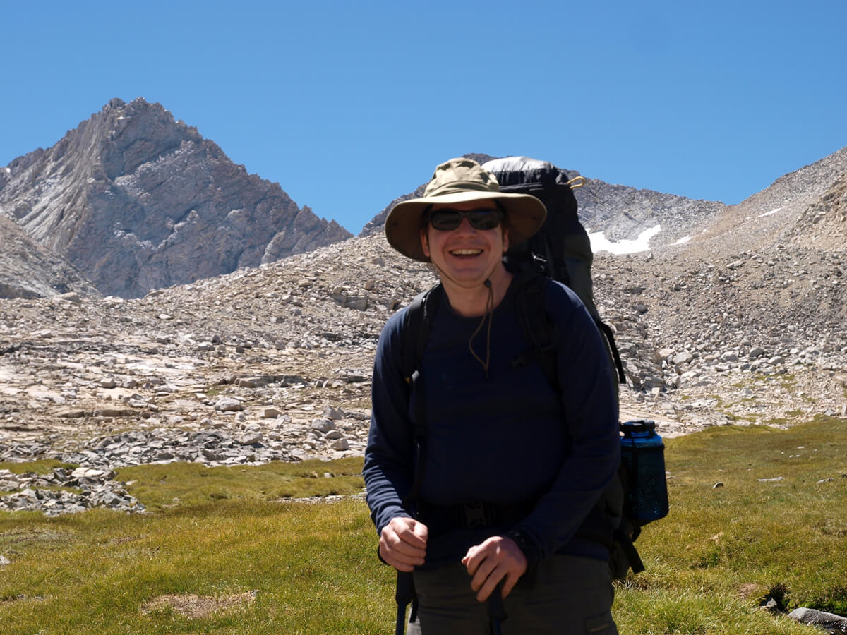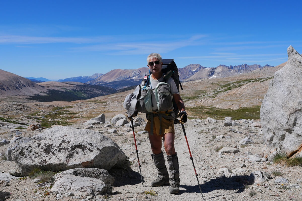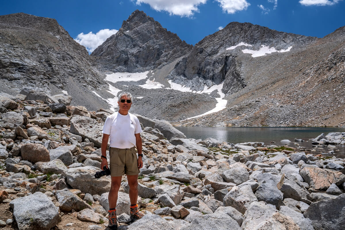 2018 年のこと、やはり北向き JMT の時、ジャンクション・ピークの直下の池でカメラを持っていた重装備のハイカーとあった。バックパックは 27~28kg と筆者と同じ。ソニーのフルサイズ・カメラと交換レンズ多数を持ち歩いていた。名前はキャーム・アンダースン。写してもらった写真を図 3.16 に示す。
