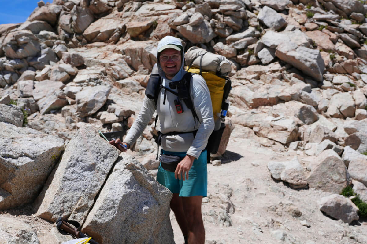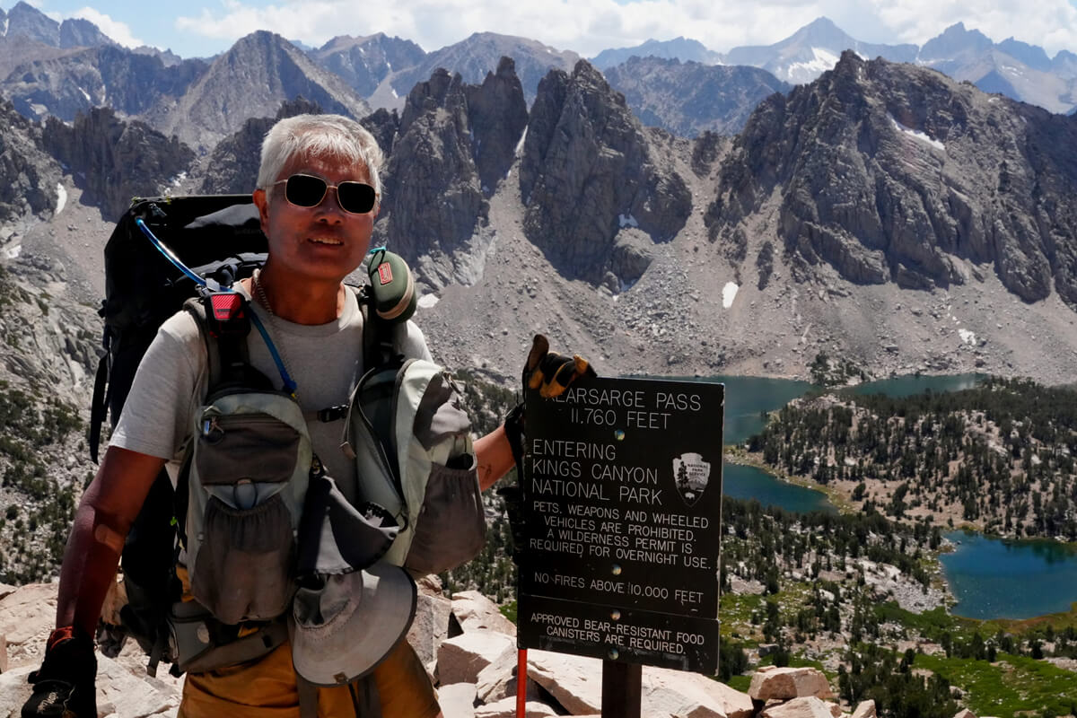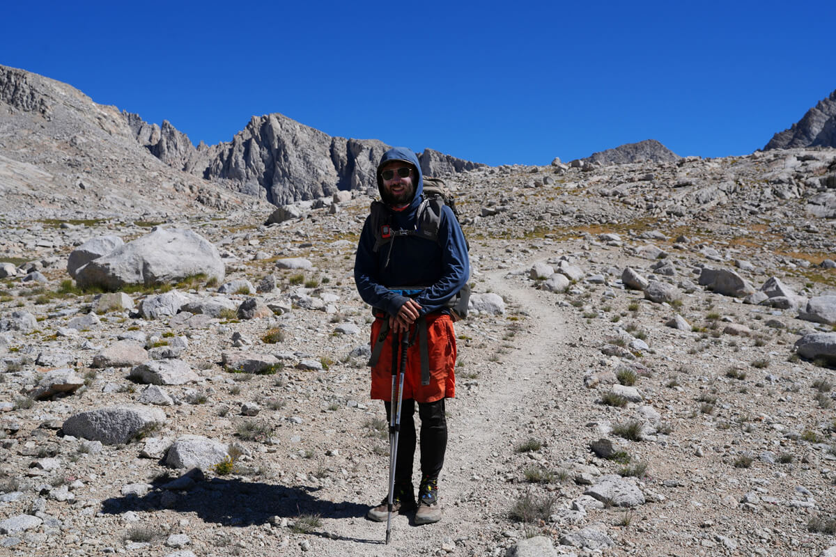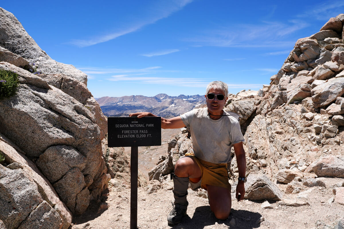 トレイルは非常によく整備されてなめらかである。残念ながら、落石で所々歩きにくい場所が出来ていた。ハイカーに追い抜かれながら、パスに着いたのが 1 時である。午後になってしまったが、幸い、晴天続きで問題はない。誰もいなかったので、写真を撮っていると、一人、上がってきたハイカーがいた。名前はエリック・サール (写真 3.15) で、PCT ハイカーだった。今年は雪が少ないので、ハイシェラをもう一度歩いているという。
