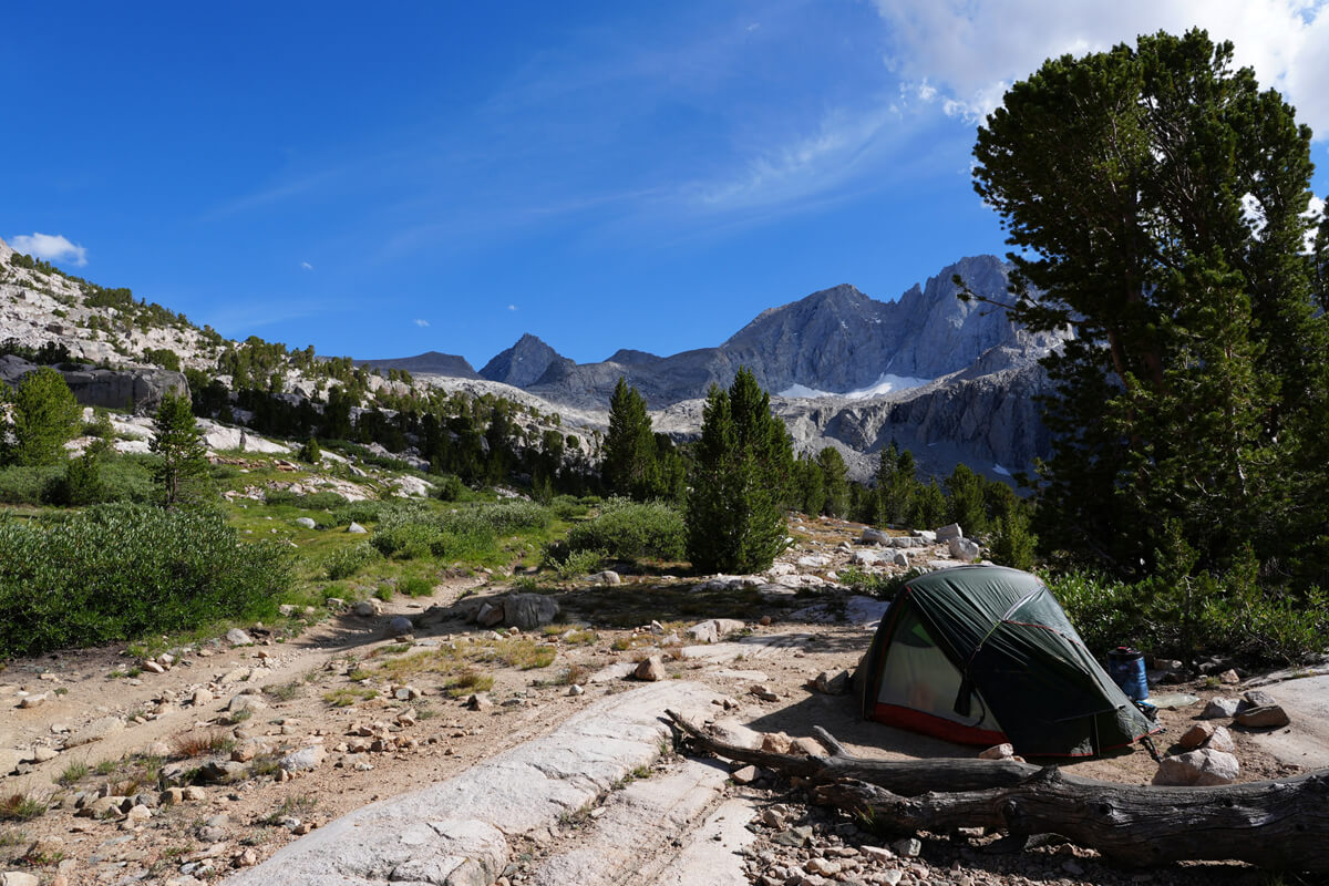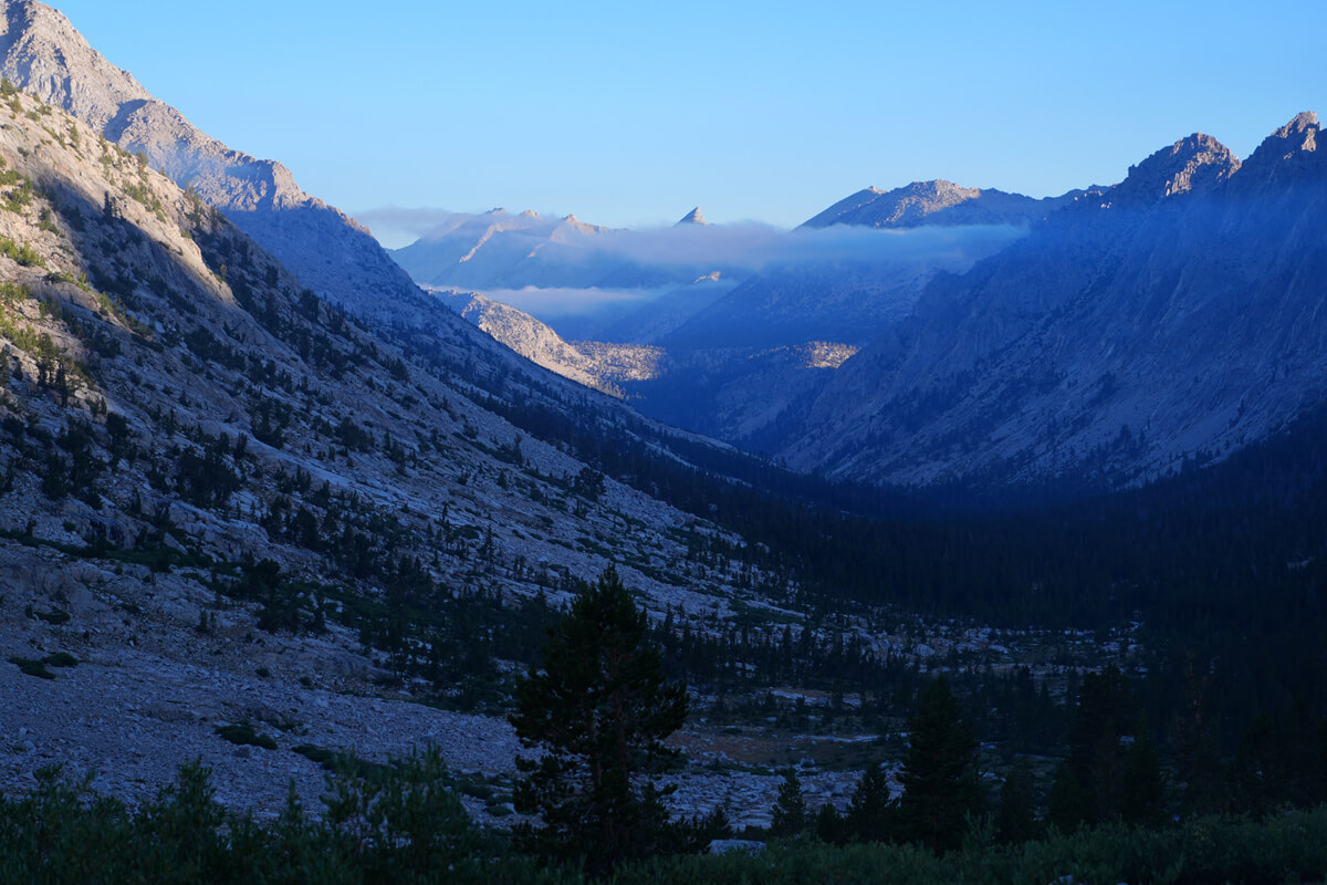 朝は 6 時前に目が覚めた。10 時間ほど寝た。5 時半頃から明るくなる。ランタンは少し使うだけだった。バックパックの上に取り付けておけばソーラー充電なので、無限に使える印象である。朝食は JMT パンとドライフルーツとコーヒー。わりときちんと食べたので、予定通り歩けそうである。パッキングして出発したのが 7 時半で、少し遅めの出発だった。