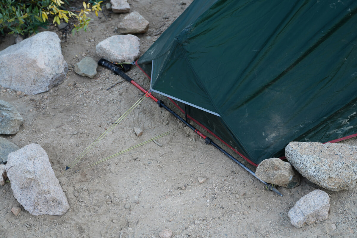2019 年にはピークスのカメラマンが同行していたので、距離が稼げなかった。そこで、高度を完全に下げる前に水を探してテントを張った。今回も水の場所は知っているので、見晴らしのよい場所とした。ところが、テントを張ろうと思っていた場所に 5~6 名のハイカーが休憩していた。あまり面白くなかったので、先に進んだ。右側に涸れかけの小川があり、水たまりがあった。水を汲んで浄水すればキャンプ可能である。時刻は 4時、山側は花崗岩の床なので、岩とトレッキング・ポールを使ってテントを設営した (図 3.19 と 3.20)。