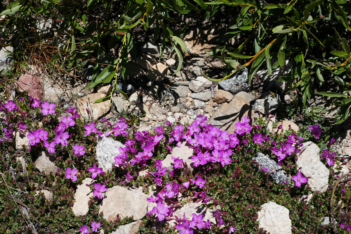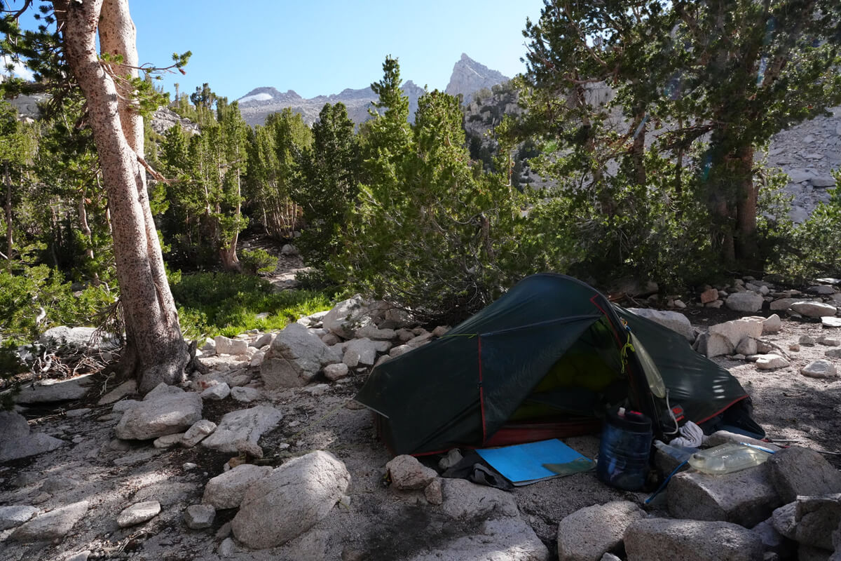 短いスイッチバックを繰り返すとハート・レイクが見える。湖の周りが急斜面で日陰もなく、テントは難しい。トレイルが北に向かい、しばらくすると、水たまりが見えた。近づくと小さな湖である。水がしみだして小川が始まっている。よく見ると裸地もあった。トレイルから離れて一直線に向かう。いくつかサイトがあり、日陰にテントを設置した。