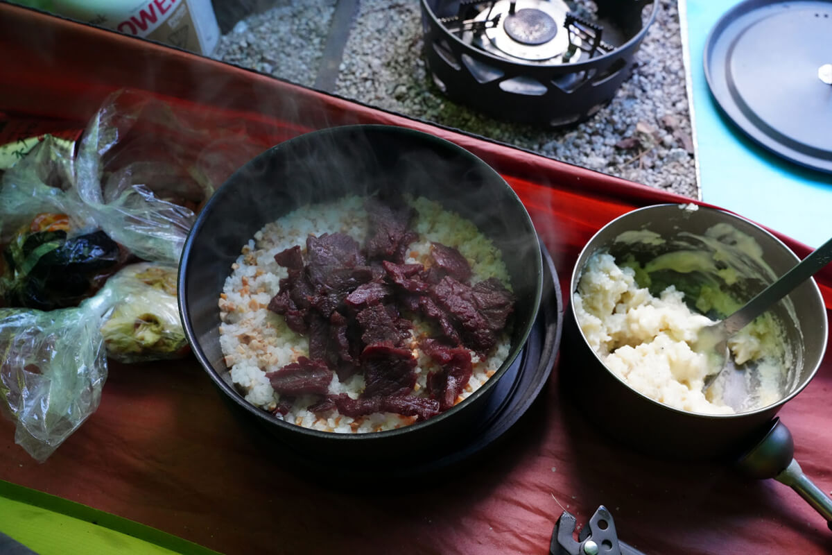 まだ、午後 3 時だった。時間があったし、二泊するので、洗濯をしてトレッキング・ポールに干した。もちろん、洗濯と言っても洗剤は使わず川の水で洗うだけである。夕食はビーフ・ジャーキーご飯。食料はまだ残っていた。明日はいよいよオニオン・ヴァレイ往復である。