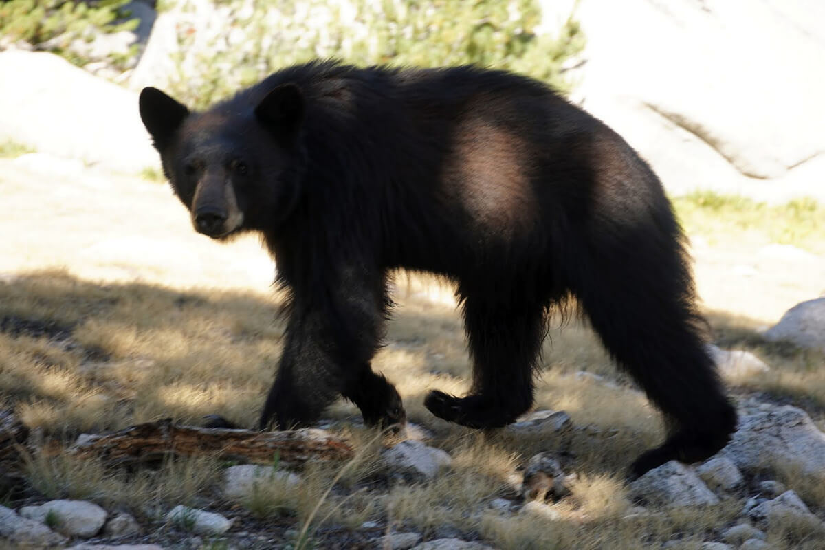 「お前の食う物はないよ」と言って、カメラを取って構えるとすぐに逃げられた。この時はペンタックスの一眼レフで、ピントが合わず、やっと撮れたのが図 3.26 である。表情をみれば分かるが、自分の食べ物がないと分かり、しょげた顔をしている。たぶん、シャーロット・レイクに出没していた熊だろう。もう一度、現れることはないと思ってぐっすりと寝た。もちろん、二度と現れなかった。この写真をアメリカのフェイスブック・グループに投稿したところ、ゆっくり後ずさりしたかとか、大きな音で追い払ったのかとか、いろいろ聞かれたが、アグラして食事していただけで、後ずさりなんかできない。小さな声でお前の分はないと言って一眼レフをとっただけである。