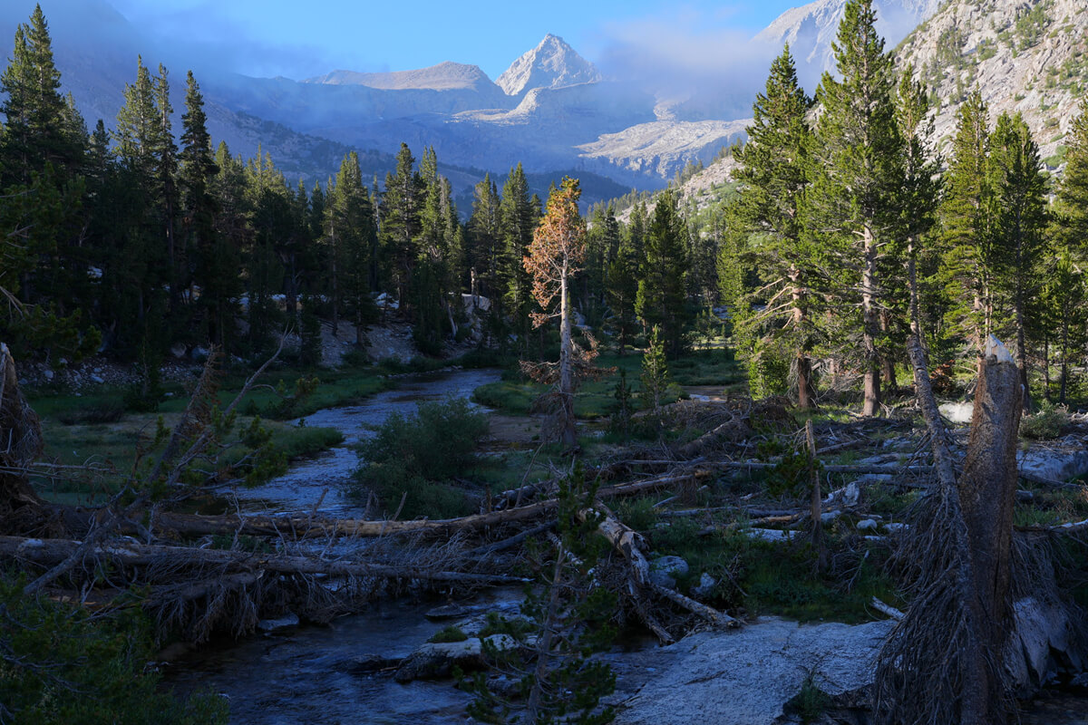 バブス・クリークのすぐ傍に来た。二度ほど、この右手の奥でテントを張ったことがある。クリークのすぐ傍まで行って撮影したのが図 3.22 である。少し露出不足なので調整した。いつでもきれいに撮影できるわけではないが、今回は早朝なので、陰影がよく出ている。