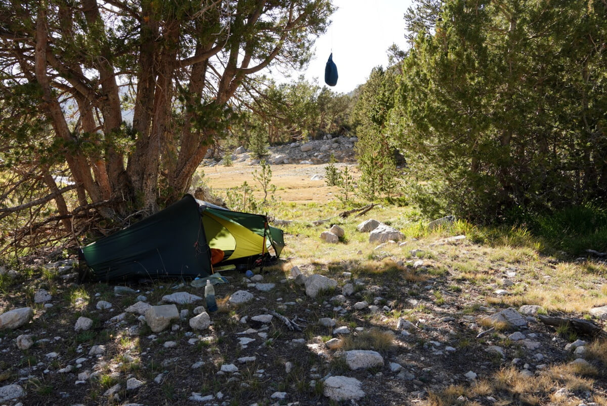 2022 年も北向き JMT で、オニオン・ヴァレイを下りて補給するつもりだった。ブルフロッグ・レイクはキャンプ禁止なので、少し上流まで歩いてテントを張った。それが図 3.25 である。フード・ボックスで拾った食料を調理して、食べていた。ちょっと前を見ると、熊の顔があった。