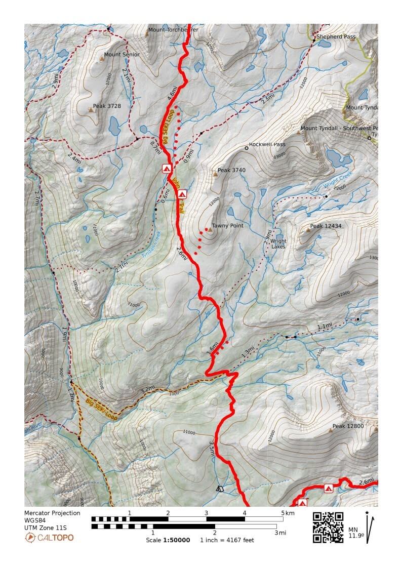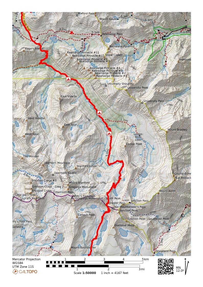 クラブツリー・メドウからティンダル・クリークまではゆるい下りで、渡渉後にゆっくりとした登りになる。登りは2~3 段階に分かれる。右手にダイヤモンド・メサという岩山が並び、細長い湖と平行にトレイルが進む。壁のようなフォレスター・パスが迫る。下りも何段階かに分かれる。スイッチバックと尾根をこなして、ジャンクション・ピークの真下に来る。それから北に進み、大きく西に方向転換して、もう一度、北に向かう。かなり長く、幅の広いパスで、雷雨の可能性が小さい午前中に越えるべきである。一度、かなり酷い雷雨に遭った。トレイルが北に転じると、左手にキャンプ・サイトが現れ始める。トレイルはバブス・クリーク沿いに伸びて、5~6km で、方向転換して登る。そして、ブルフロッグ・レイクを経てケアサージ・パスに達する。3 日程度の距離である。