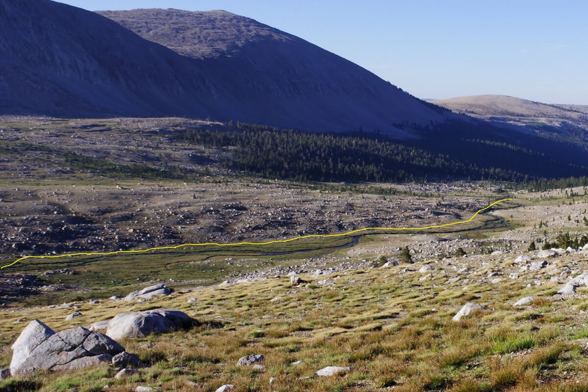 一見して分かるようにティンダル・クリークは平原状の場所を流れている。岩場はほとんどない。つまり、増水時には渡渉せず、シェパード・トレイルを少し歩き、それからは川沿いに歩いて行けばよい。上流に行けば簡単に渡渉できるし、見通しが良いので道に迷うこともない。