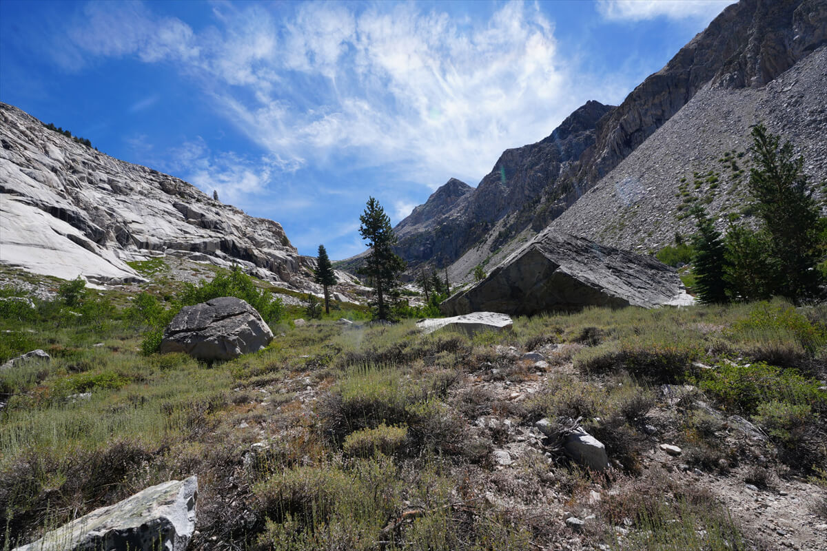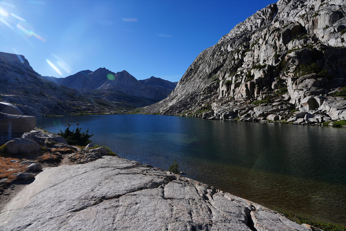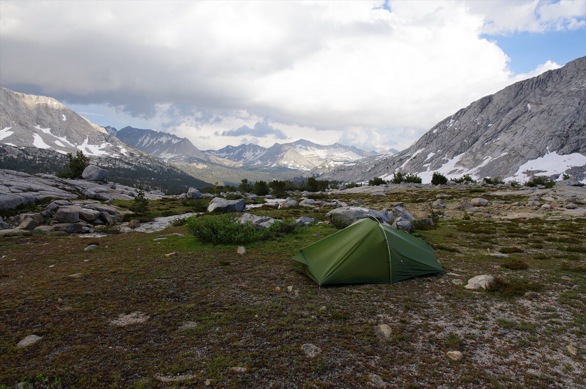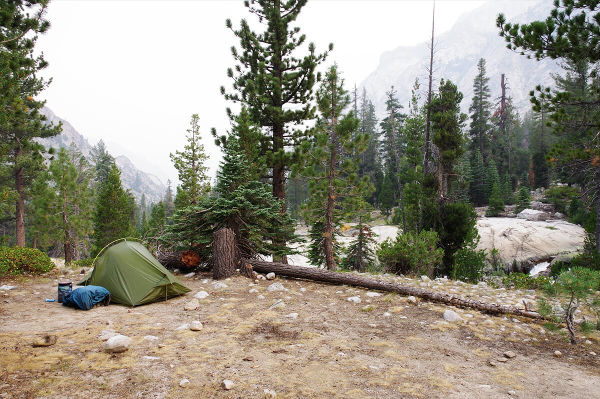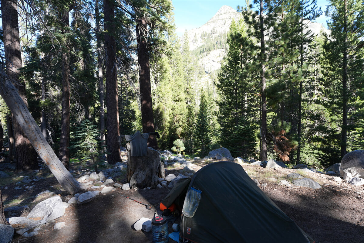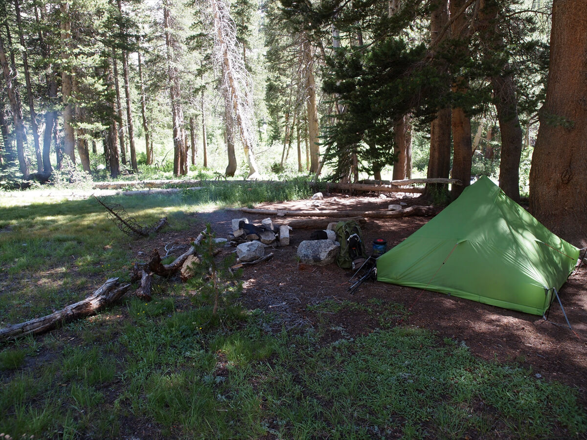 左足指のガングリオンが大きくなってきて、痛み始めた※1。下りはべた遅れ。2 時過ぎにスイッチバックを終了、3 時半になってもアッパー・パリセード・レイクに着いていない。広いキャンプ・サイトの手前には小川がある。最初の JMT ではキャンプ・サイトが混雑していて、ここの茂みに張った。トレイルはこの小川を渡ってキャンプ・サイトに向かうのだが、トレイルが下流の方向に刈り込まれていた。