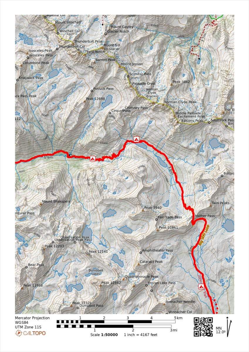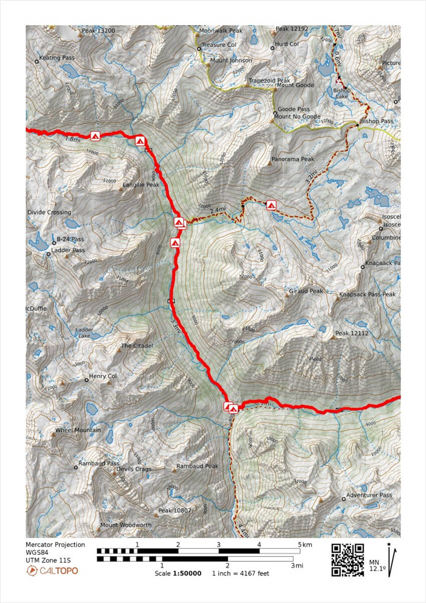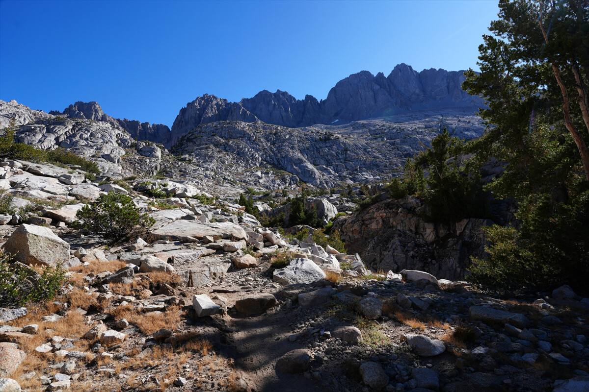 体力が回復してからビショップ・パスへの分岐に入り、デュシィ・ベイズンで一泊し、次の日にビショップに脱出した。たまたま歩いたルートだが、景色の素晴らしい所だった。このルートはサン・ホアキン川の橋が崩落した時にミューア・パスの迂回ルートとしても活用された。後にこのルートも説明する。