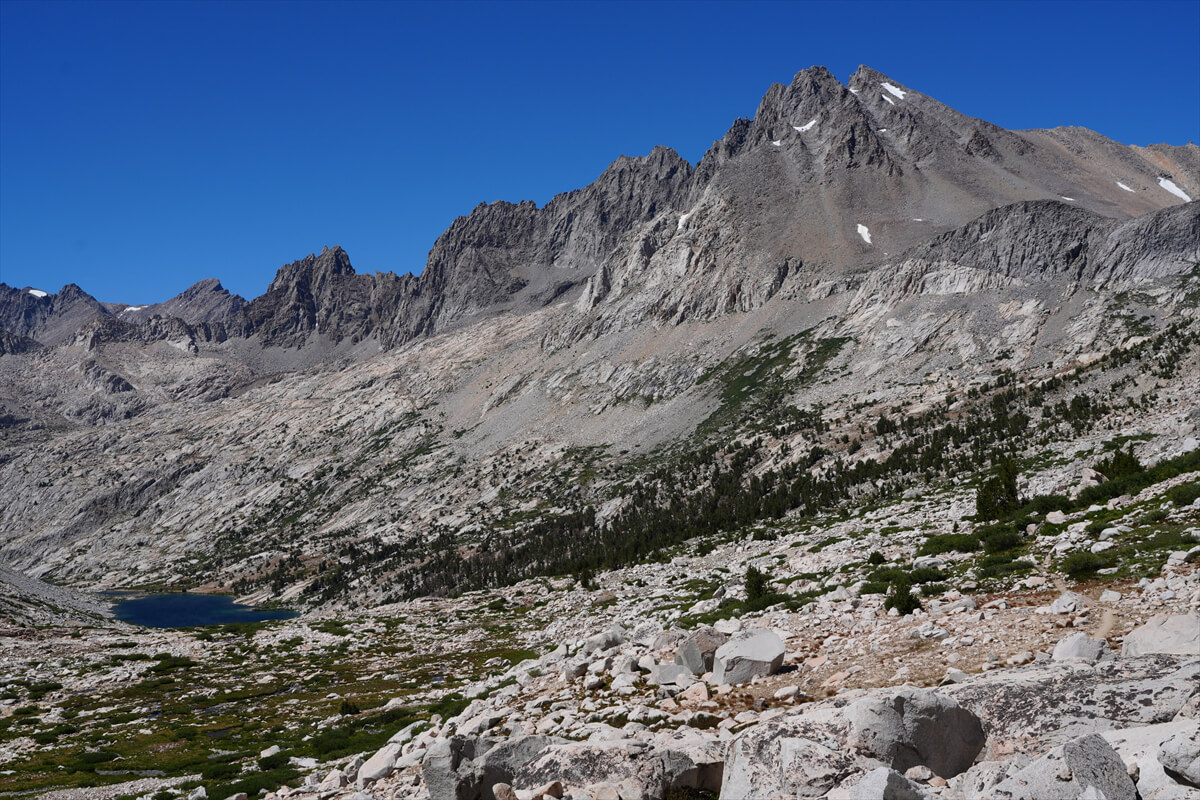 少し下りていくとディスアポイントメント・ピークが良く見える。なぜ、こんな残念な名前が着いたのか。初登頂は 1919 年のディビスらのパーティで、ミドル・パリセードの最高峰と思って登ったら、違っていて、がっくり来たということが由来である。眺めると素晴らしい岩山で、最高峰と勘違いするのは当然である。なお、左手に見える小さな水たまりはアッパー・パリセード・レイクである。