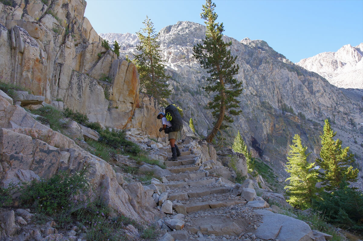 景色を一望すると、ゴールデン・ステア・ケースが始まる。翻訳すると「黄金の階段」で、膨大な建築費がかかったため名付けられた。JMT 屈指の難工事だった。2019 年の南向き JMT の写真(図 6.16) が分かりやすい。これを下り切るのに 1 時間以上かかる。