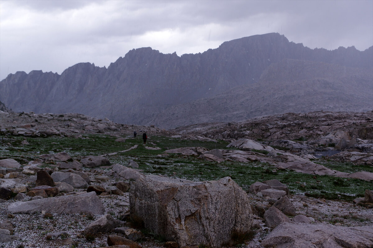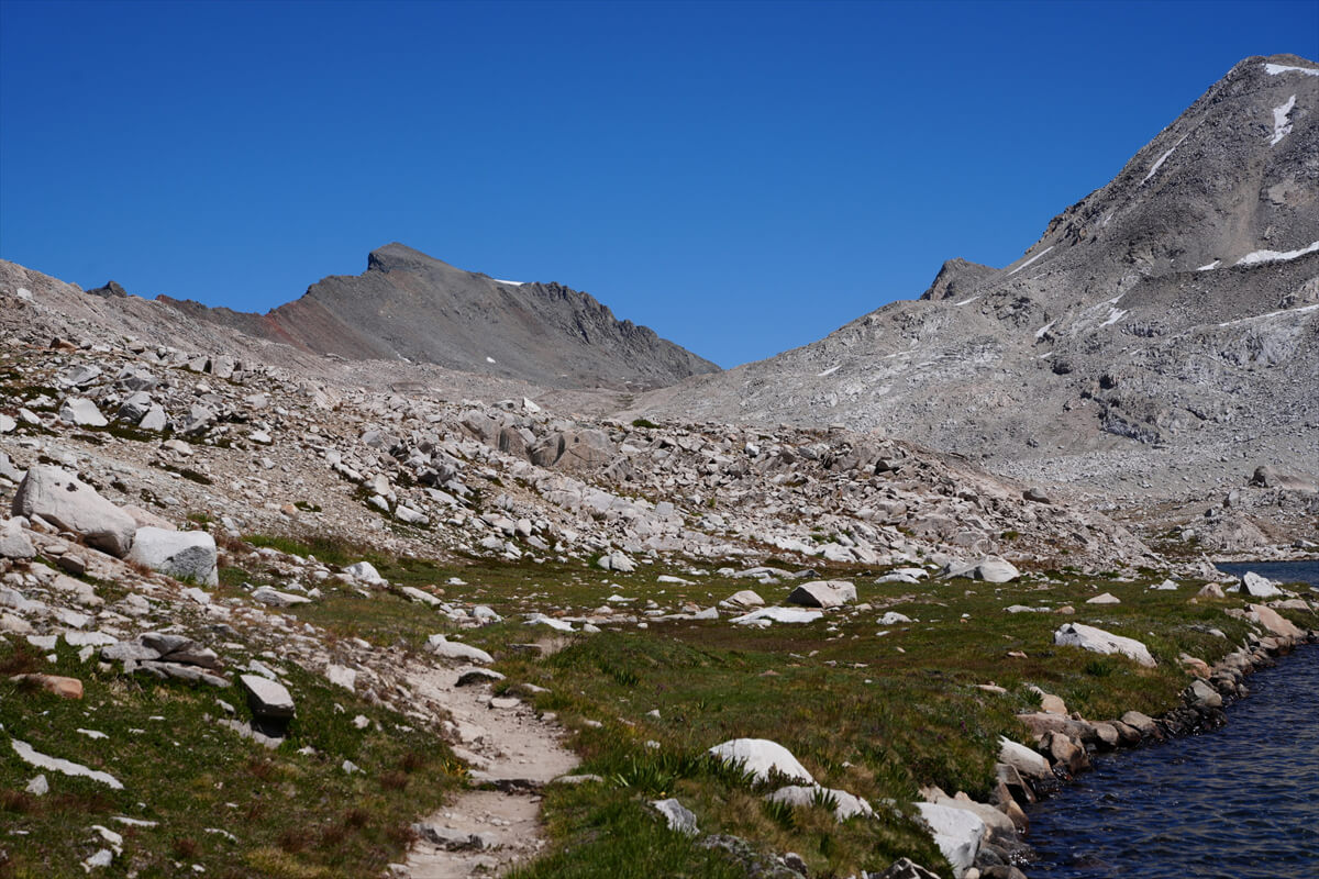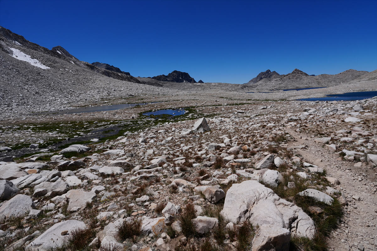 ミューア・パスからはスイッチ・バックを少しこなすと、比較的平坦な下りになる。岩だらけの高原だが、トレイルはきちんと整備されている。いくつか、小川を横切るところだけ、少し荒れているが、これは仕方ない。水も入手できるし、筆者がキャンプしたように、植生は乏しいので、高所順応しておけばキャンプは可能である。