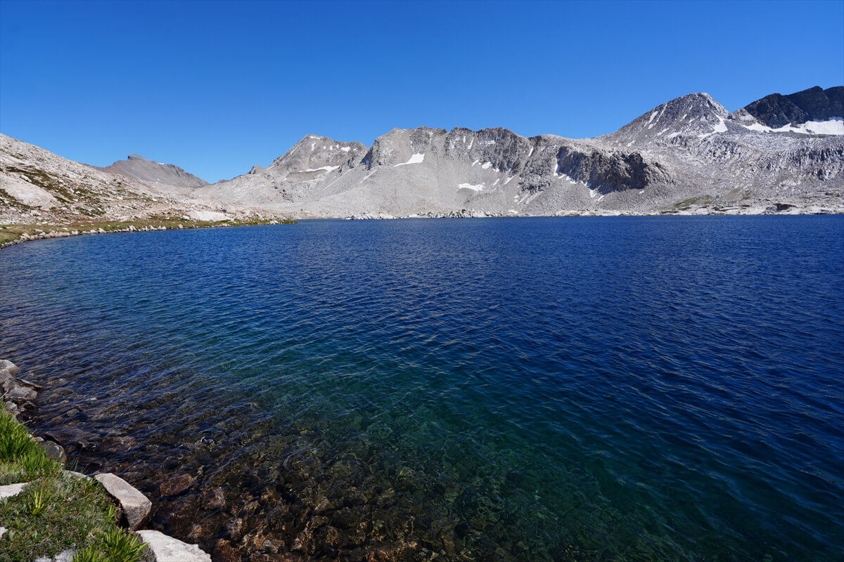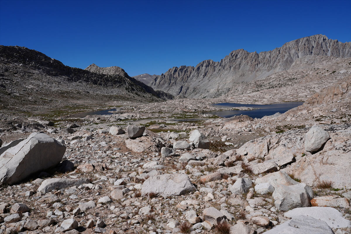 30 分ほど歩くと、トレイルはレイク・マクダーマンドの傍を通る。少しだけ岩の間を歩くと、最大の湖、ワンダ・レイクの湖岸に達する。ワンダはジョン・ミューアの娘の名前である。ワンダ・レイクからミューア・パスを振り返ると図 8.6 のような風景である。