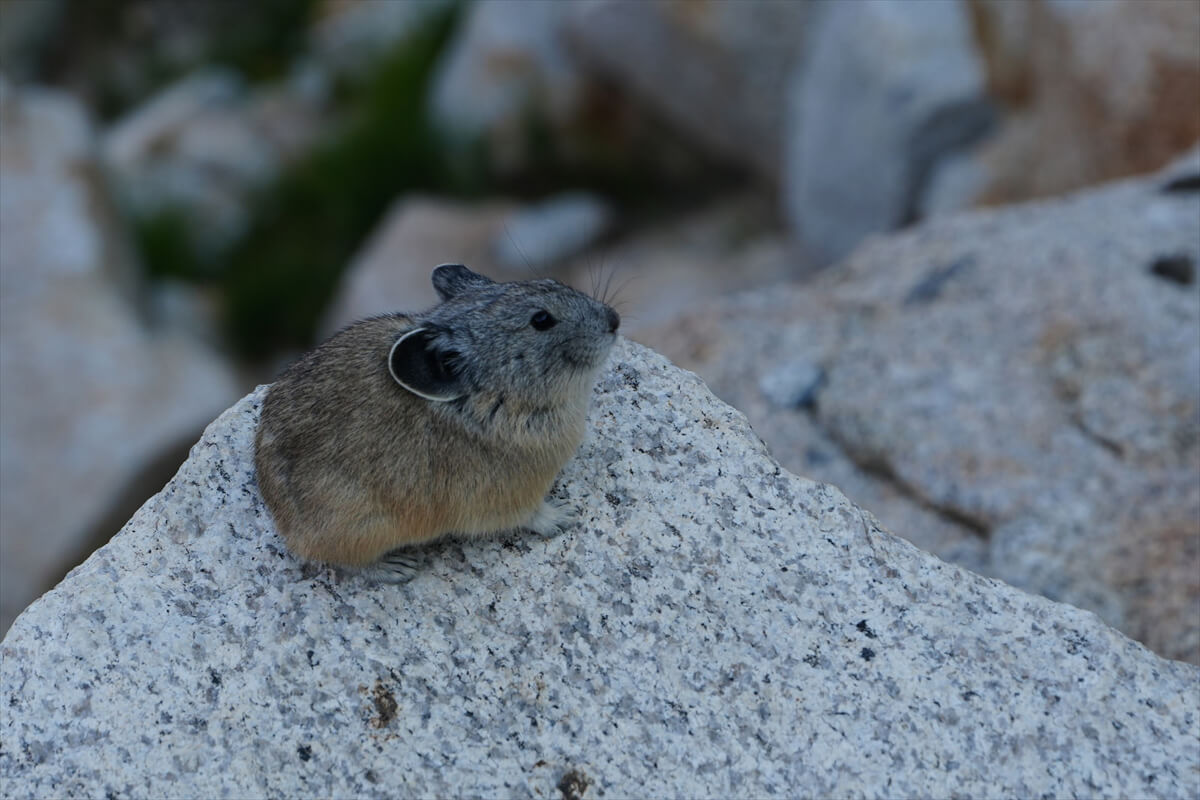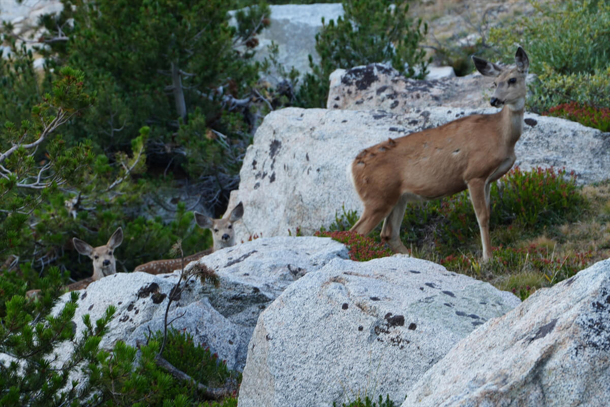 岩の間のトレイルを歩くと、今度はナキウサギが現れた。どうしたわけか今年は二回目で、あまり逃げない。図 8.14 に示す。さらに子連れの鹿も現れた。ここで鹿を見たことはない。図 8.15 に示す。グロース (雷鳥)もいたが、撮影には失敗した。やはり、ハイカーが少ないためだろう。ここでこんなに多くの動物は見たことがない。