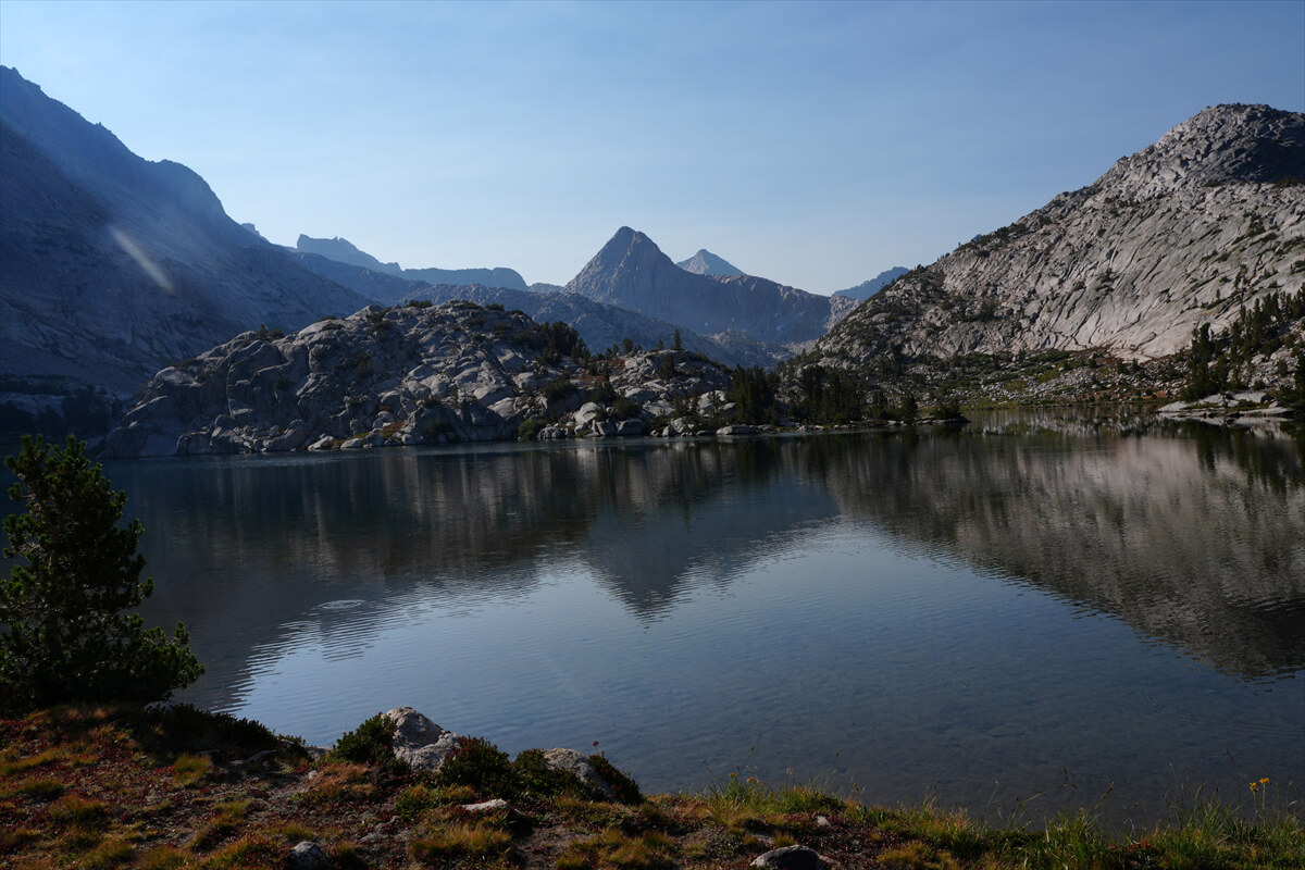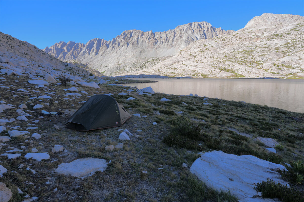 サファイア・レイクには 5 時に着いた。エボリューション・レイクまでは一時間かかるので諦めた。土地勘はあるので、湖の上流部分に張る予定で、サイトを探しながら歩いた。それらしい場所を見つけたので、オフ・トレイルで、まっすぐに下りてテントを設営した。それが図 8.11 である。