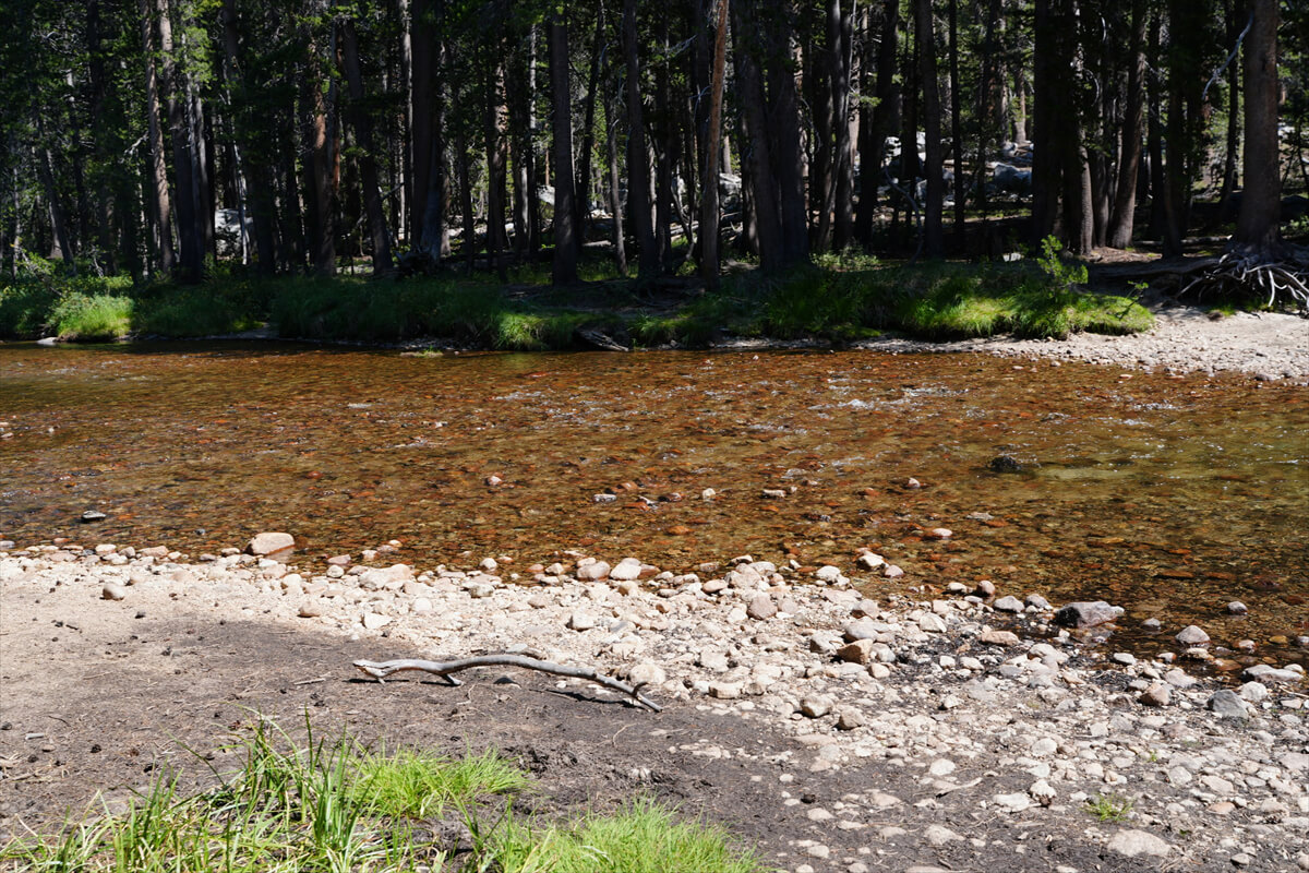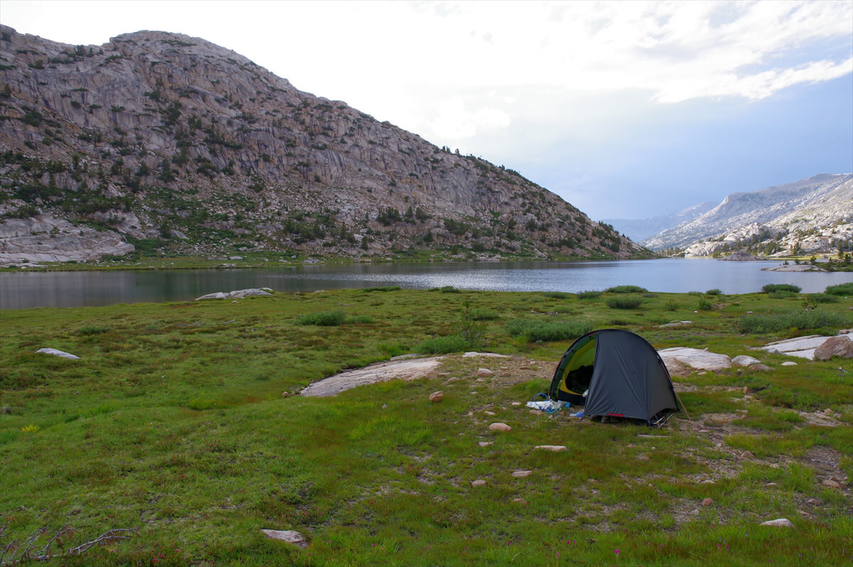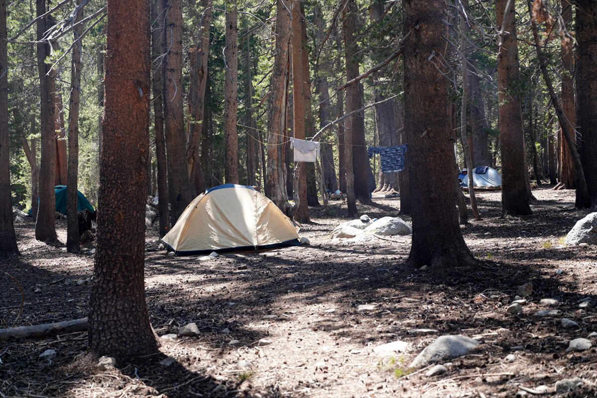 2019 年は、夕立が近づいたために緊急避難的に植生の少ない場所にキャンプした。図 8.17 である。少し上流部にタープがあった。JMT でタープ泊をするのは日本人くらいである。確認がてら挨拶に行くと、日本人女性二人だった。パーミットをとっているのか、少し心配したが、大丈夫なようだった。ウルトラライトの日本人とは話が合わないことが多いので、挨拶だけにした。