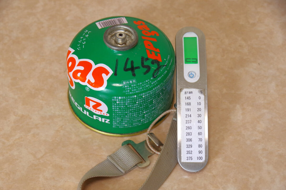 なお、正確なガス残量を調べる方法を図 8.30 に示しておく。誤差はあるが、最初にガス・キャニスターを吊るして目盛りをゼロにする。次に外すとマイナスの数字がでる。それを%に換算するだけである。MSR に専用の秤はあるが、誤差は同じなので、旅行用秤を使えばよい。食料の重さを測る時にも使える。筆者の場合は 1kg/日ならば問題はない。