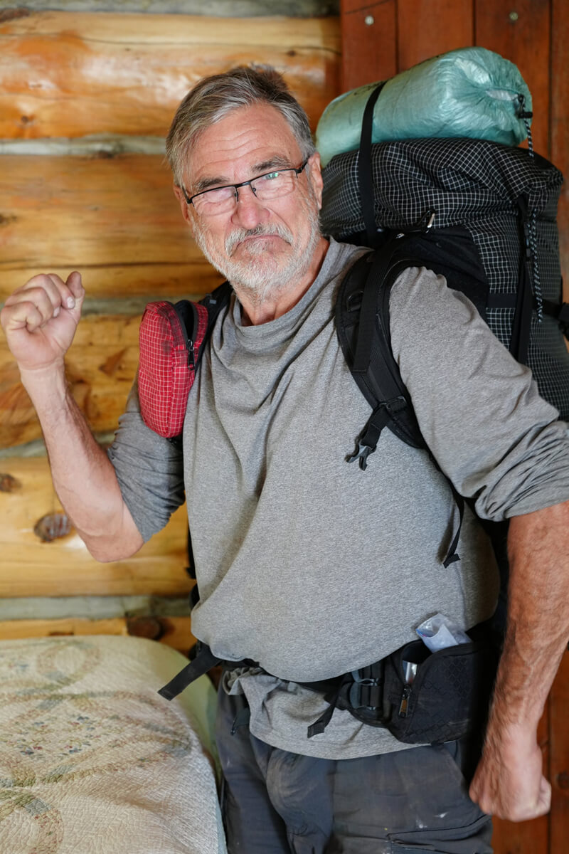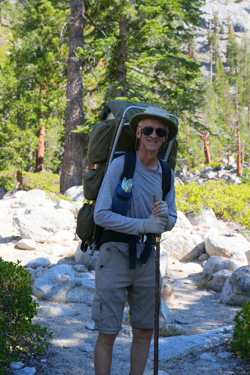 フレームパックの似合うハイカーがいたので写させてもらった。それが図 10.6 である。日本と異なり、アメリカのトレイルは馬での交易路が元になっている。狭い密林の間を抜けるトレイルはほとんどない。広い空間なので、フレームパックの愛用者はまだまだいる。