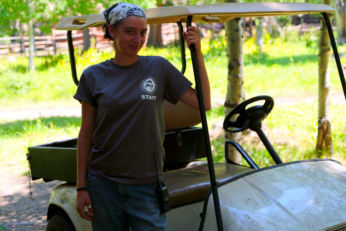 WiFi はキャビンから出るとかろうじて繋がる。ベンチのある食堂近くに WiFi の機器があるようだ。ただ、少し離れると繋がらなくなる。うっとおしいので、食堂の傍のベンチに引っ越した。酢の補充を思い出したのでスタッフ (図 10.17) に声をかけた。