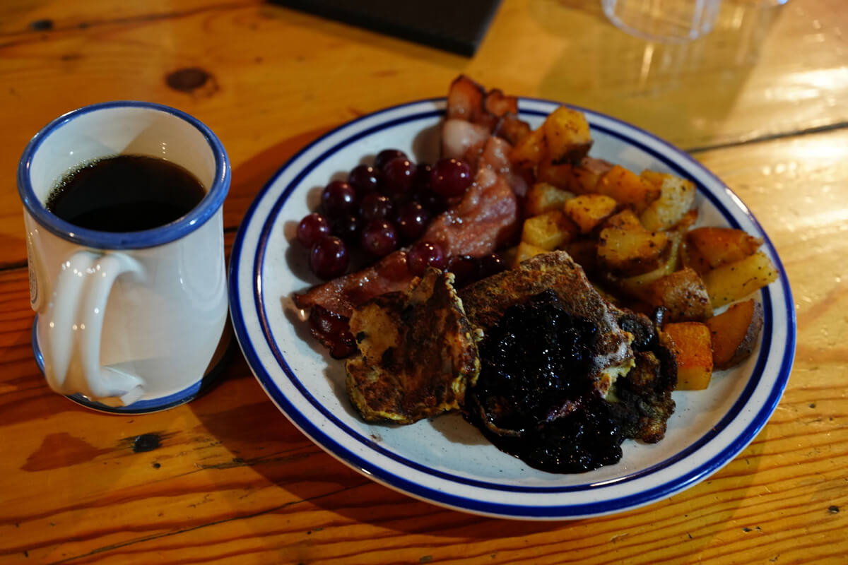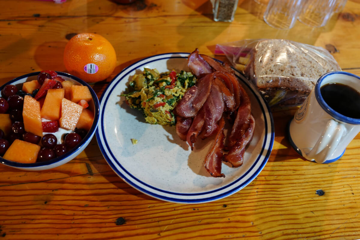 MTR の朝食は食堂で摂る。やはりビュフェ形式なのだが、どれだけ盛っても構わない。図 10.19 が初日の朝食だった。果物があるから良いけど、ベーコンとかジャガイモなどの油炒めである。手前の訳の分からない物はフレンチ・トーストということだった。どこがフレンチ・トーストなのか、よく分からない。出来損ないのパンケーキのようだ。これもジャムを乗せて、やはり食べられるだけ食べてしまった。コーヒーは自分で適当に注いで好きなだけ飲む。お昼はないので、適当にエナジー・バーを貰った。