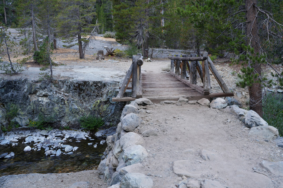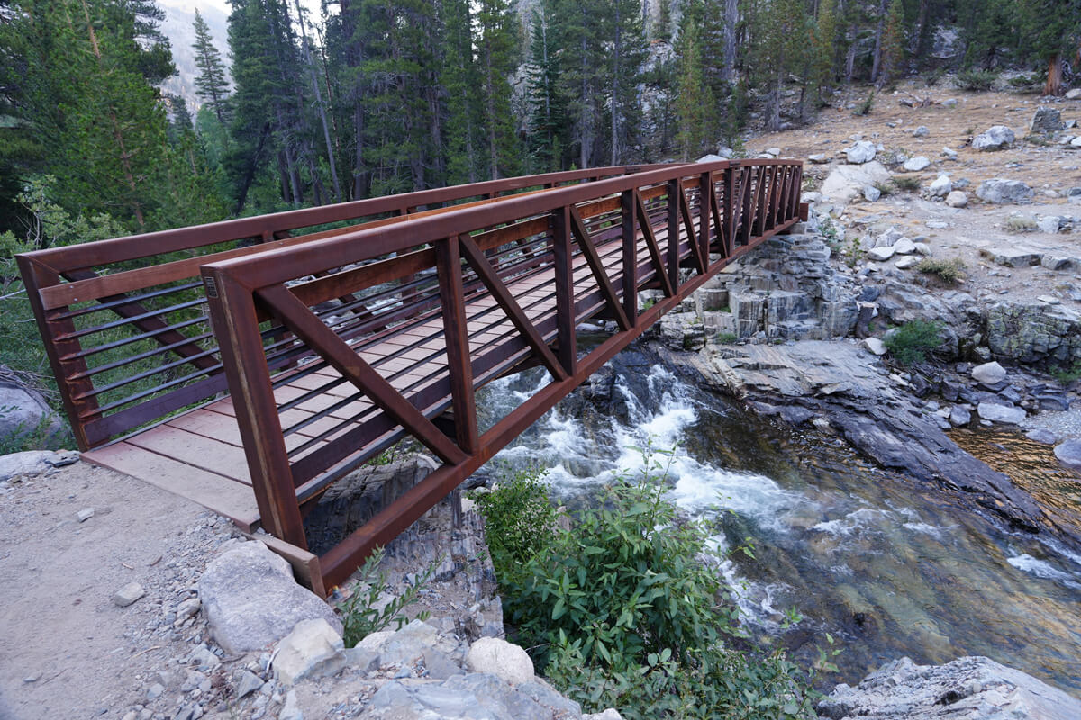 40 分くらい歩くと、図 10.3 の橋に着く。写真は渡ってから撮ったものである。左手には狭いキャンプ・サイトが、右手の林の中には広いキャンプ・サイトがある。この橋は 2023 年の大雪で崩れてしまい、大騒ぎになった。ここを通らないとミューア・パスにいけないので、大部分のハイカーは迂回ルートを歩いた。徒渉可能な場所はこの下流 100m くらいである。それも 8 月中旬以降の水嵩の減った時期以外は難しい。
