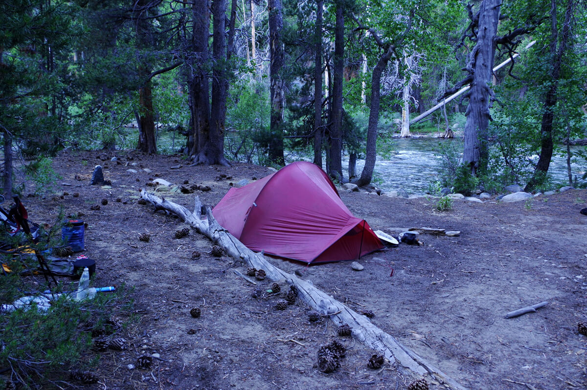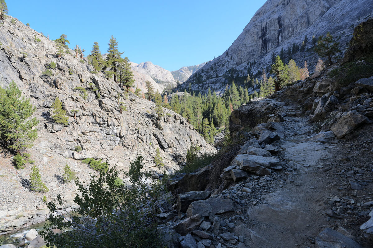 キャンプ・サイトを通り過ぎると川を渡る。サン・ホアキン川の橋と同じ鉄骨構造である。渡ってしばらくすると、トレイルはサン・ホアキン川から離れていく。川ははるか先の谷を走る。つまり、キャンプ・サイトは川を渡る前に多く、渡ってからは良い場所がない。また、すぐに巨大な倒木がある。トレイルはその倒木の幹を切断された隙間を通り、パイン・ツリーの林の中を進む。