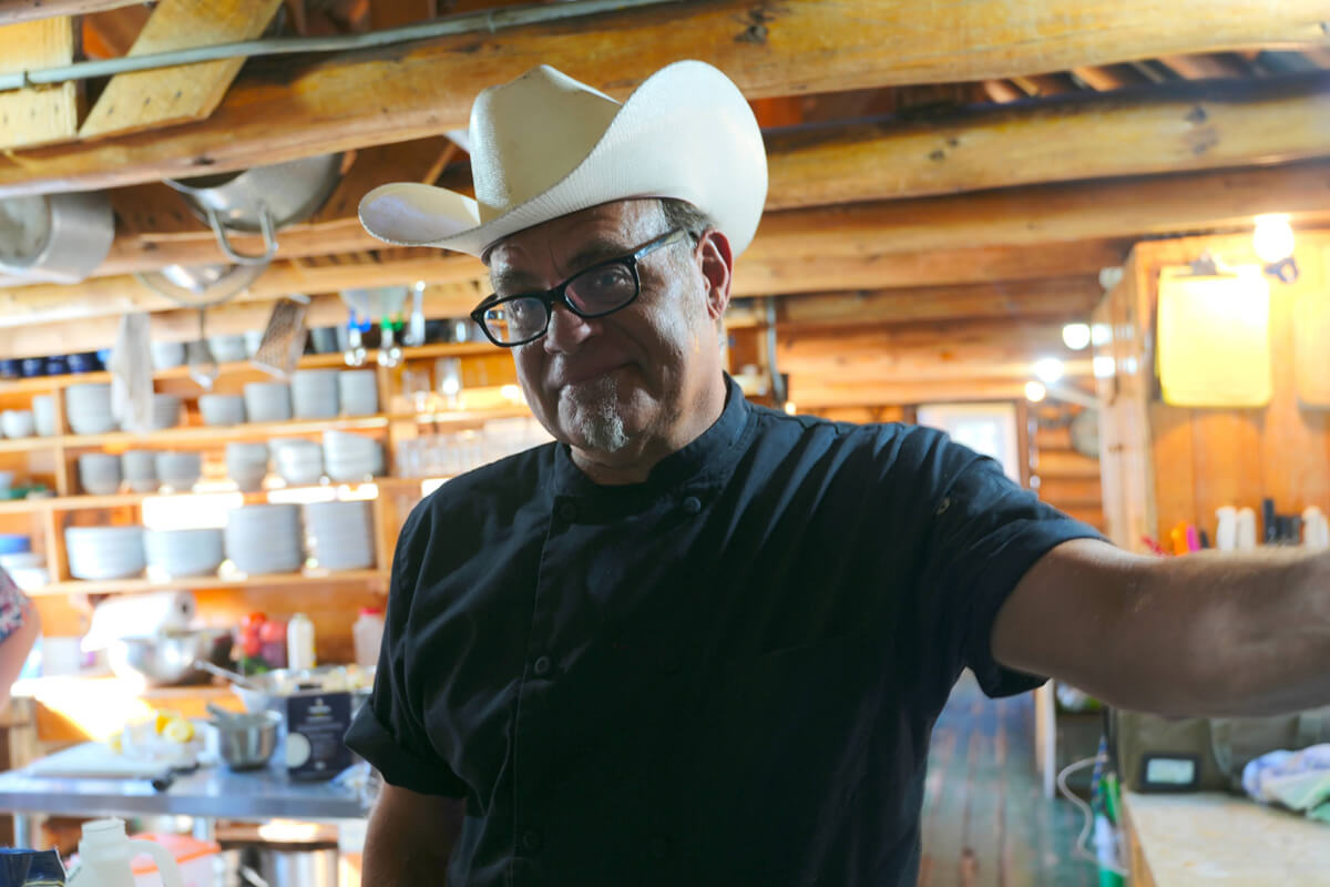 髭を蓄えたカーボーイ風のおじさんだった。建物に案内されると、レモネードの大きな透明のタンクと氷があった。5~6 杯は飲ませてもらった(図 10.11)。レストランはハンバーガーとかはなかった。ねだればエナジー・バーくらいはあったが、昼はあまり食べないので、どうでも良かった。