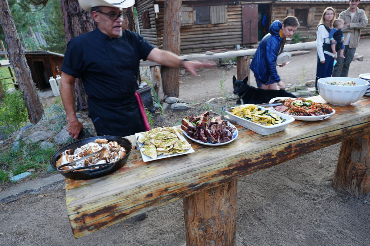 夕食が野外のテーブルに並びだした。一通り揃うと、デイブが料理の解説をする。それから皆が皿にそれぞれ好きなだけ載せていく。料理の写真を図 10.18 に示す。もちろん、筆者は最初に山盛りにして、さらにお代わりに挑戦して、根こそぎ食べようと頑張った。
