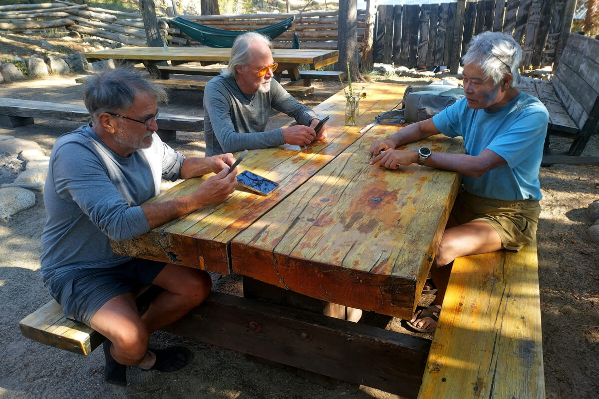 出発前に、比較的よく喋っていたラスとニックの写真を撮った。それが図 10.26 である。中央のラスはウルトラライトのアルコール・ストーブを作っていた。サンプルをジェイムズさんに見せて議論していた。彼はトレイル・デザインという会社のオウナーだった。ただ、この後、トムという人に会社を売り払ったという。ニックはソフトウェア・エンジニアらしく、筆者もプログラミングをしていたので、なんとなく話がしやすかった。左のスカイラーとはあまり話をしなかった。スカイラーとラックは一卵性双生児で、家族で MTR に滞在していたようだ。