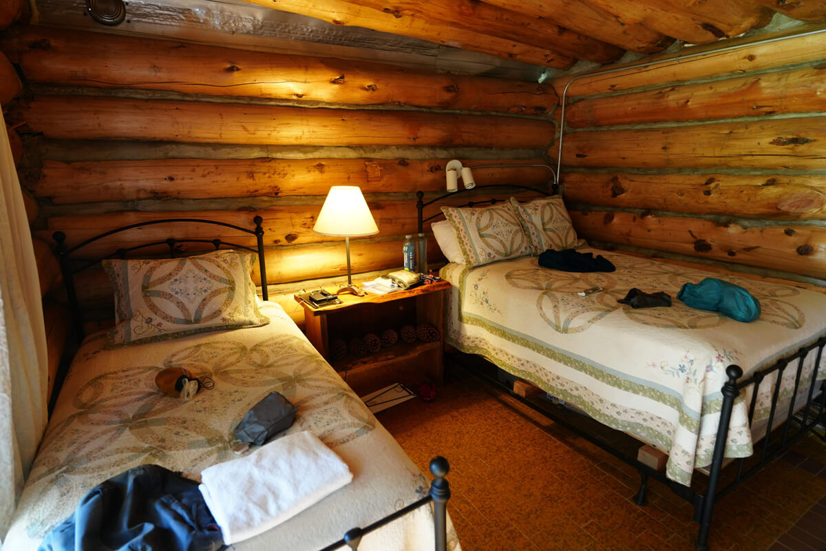ログ・キャビンの入り口と内部は図 10.13 と図 10.14 である。ジェイムズさんはまだ来ない。来るとしても夕方だろう。荷物を置いて貴重品と着替えをもって温泉に入ることにした。