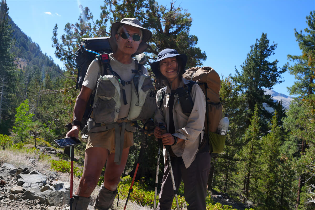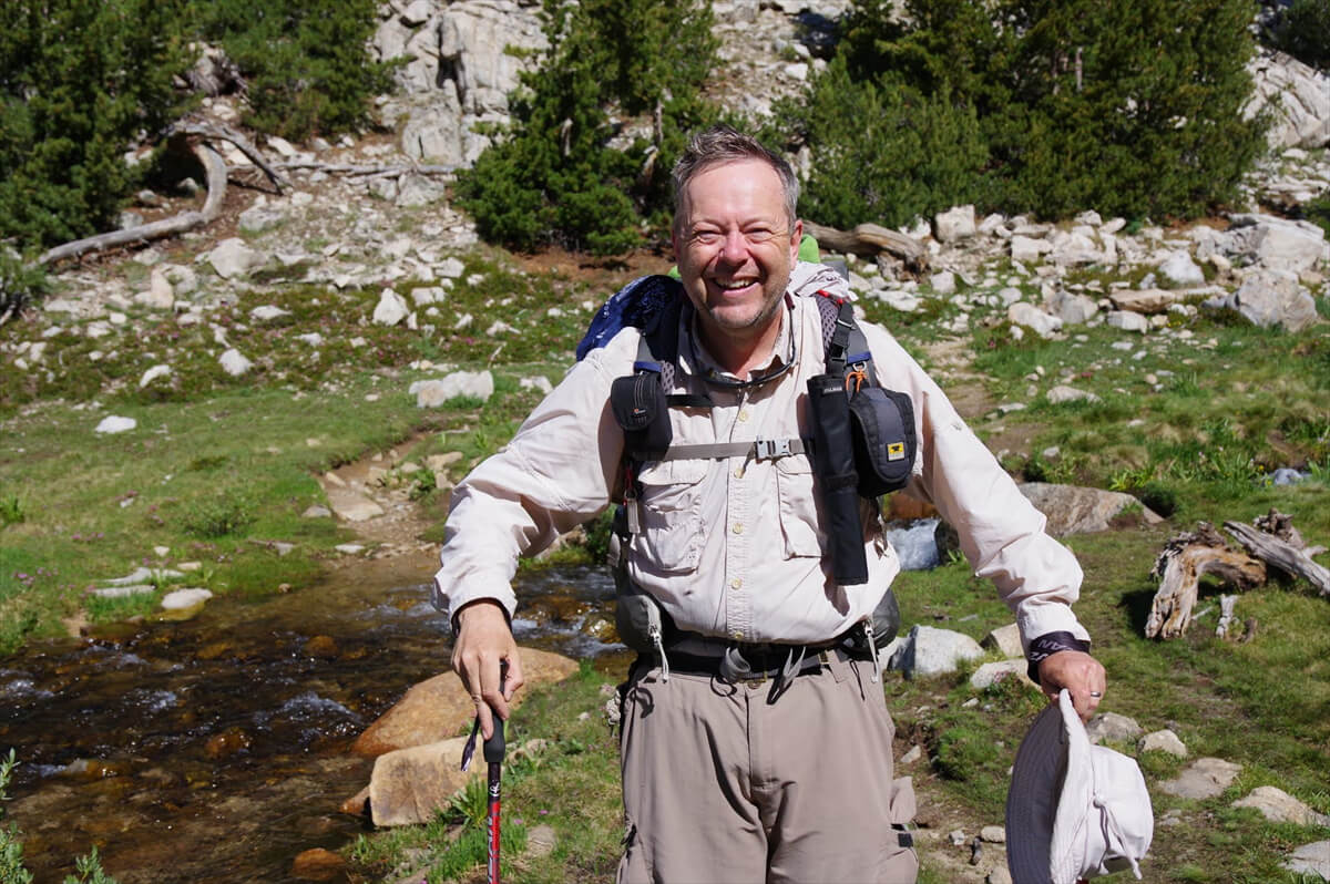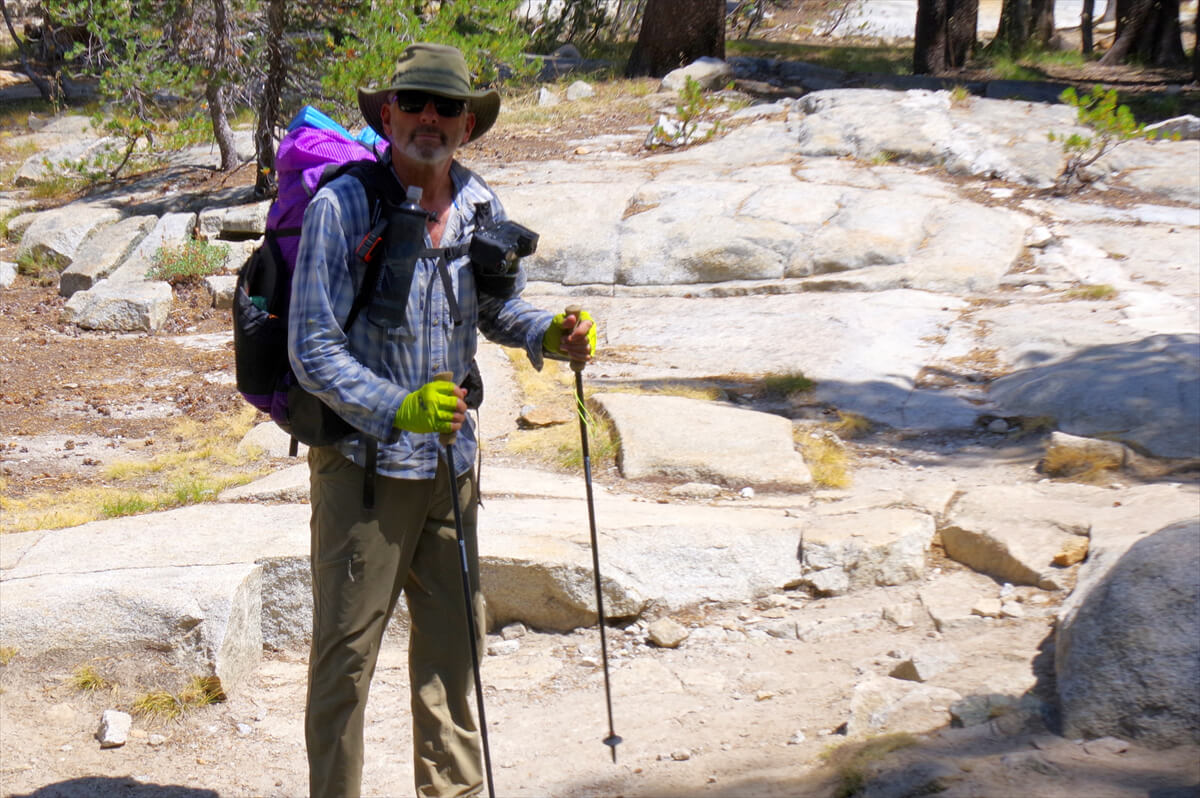 高度を下げて、多少は安全と考えて、木陰で休憩して、浄水器で水を作成した。その時、アメリカ人ハイカーが来たので写真を撮ってもらった。雷は順調に収まったが、2時間ほど後に、ベア・クリークを徒渉した直後、近くの丘にドカンと落雷があった。この後、ずっと VVR まで雷に付きまとわれた。その後、ヨセミテは山火事で封鎖になった。JMT の天気は一週間から 10 日くらいの周期で変わる。天気が悪い時は、ずっと悪い。運が悪い時は、ずっと運が悪い。