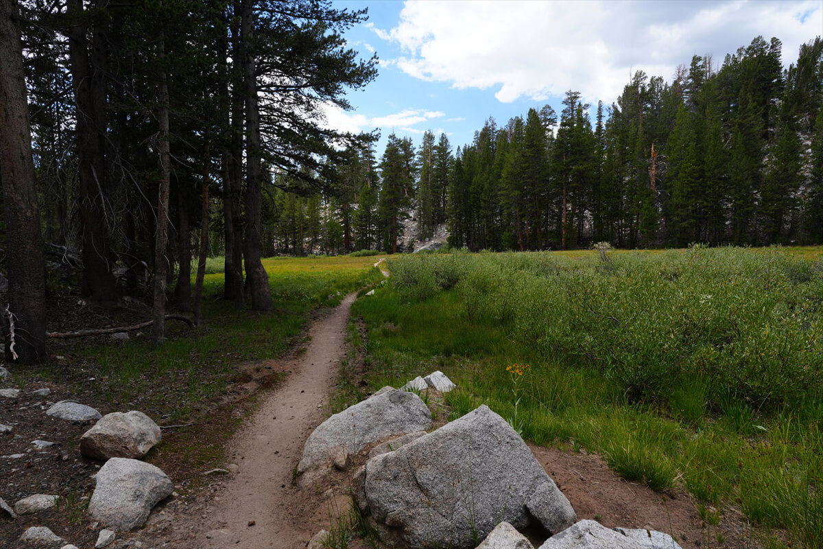 このキャンプ・サイトから川沿いにメドウが広がっている。最後に広いサイトがいくつかあり、飛び石伝いに川を渡るとベア・クリークへのスイッチバックの下りである。