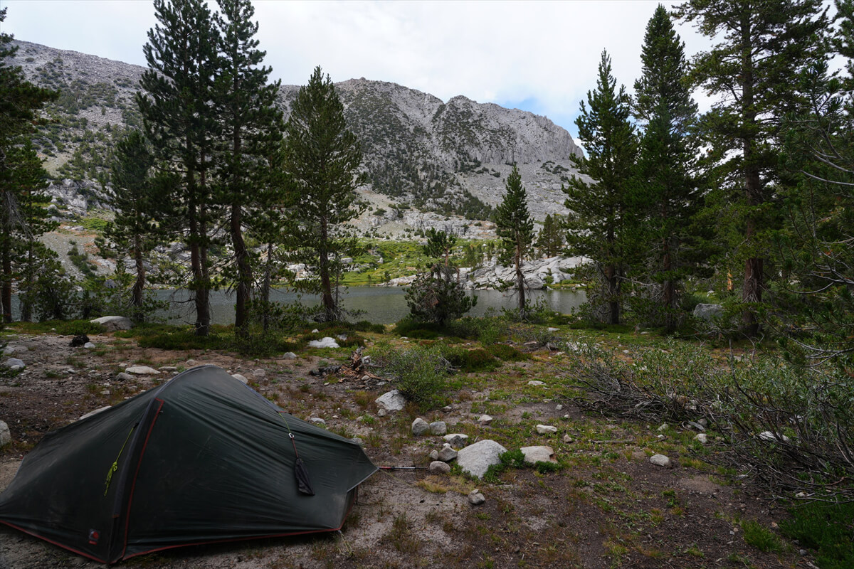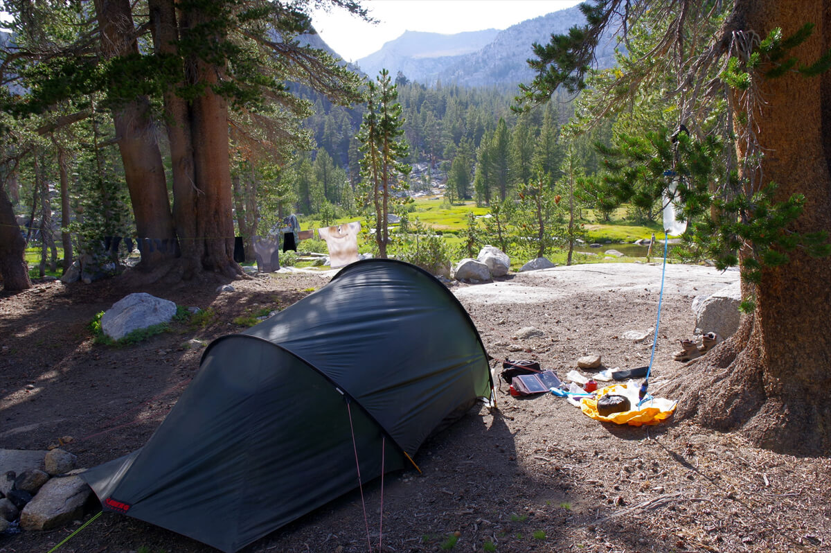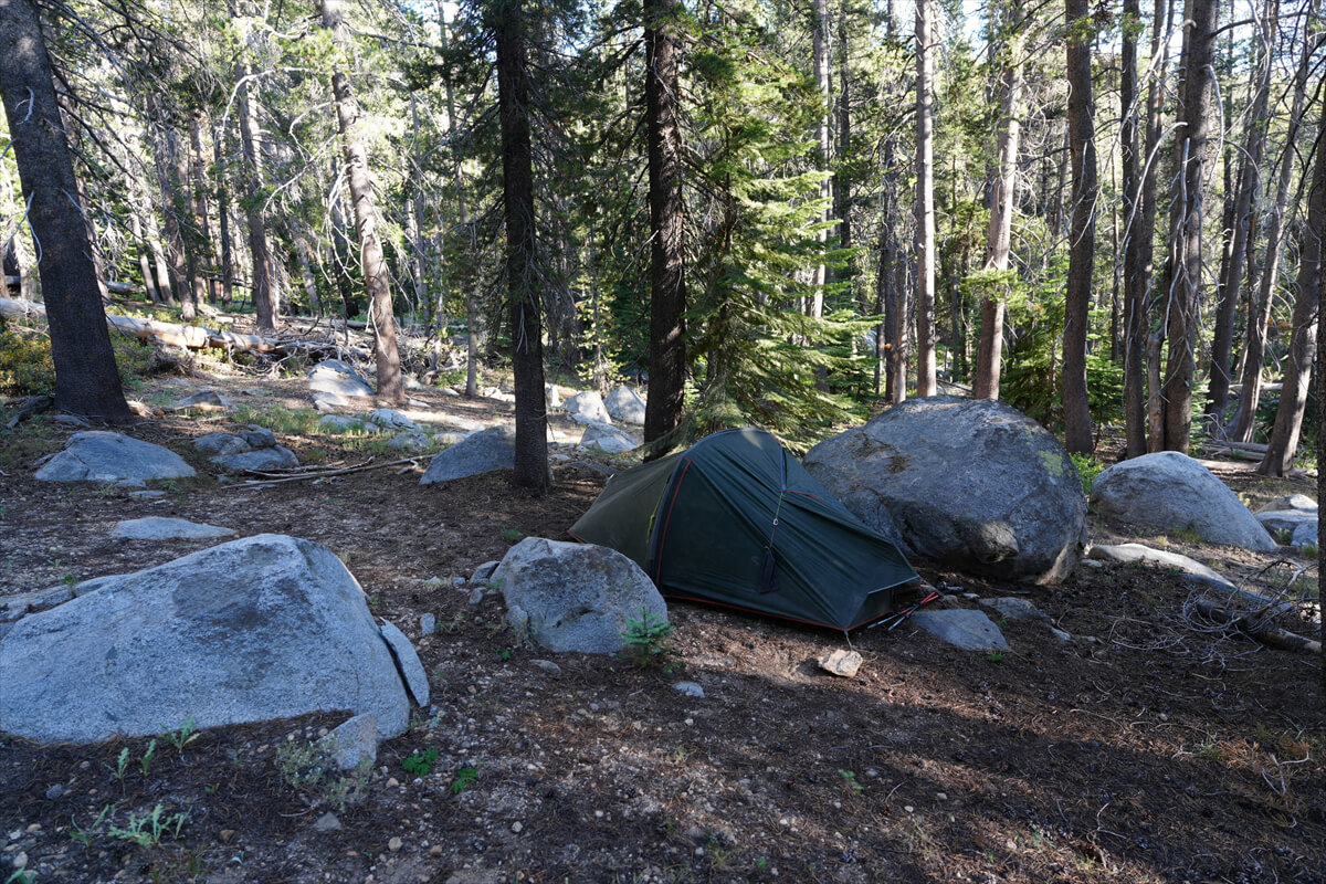今年はマリー・レイクから流れ出る川の水は少なかった。岩の上を普通に歩いて渡った。しばらくはなだらかな下りだが、少しずつ勾配を増す。左手には川が見えて、少しずつ遠ざかる。最後のスイッチバックで高度を落とすと、メドウが見える。ローズマリー・メドウである。狭いメドウだが、水平な地形になるので、キャンプ・サイトが点在する。一番、よい場所はローズ・レイクに向かうトレイルとのジャンクション付近で、ちょっとした高台で奥まった場所である。少なくとも 2019 年と2023 年にテントを張った。2019 年のキャンプを図 11.20 に示す。洗濯物を干したり、この方が雰囲気があってよいだろう。