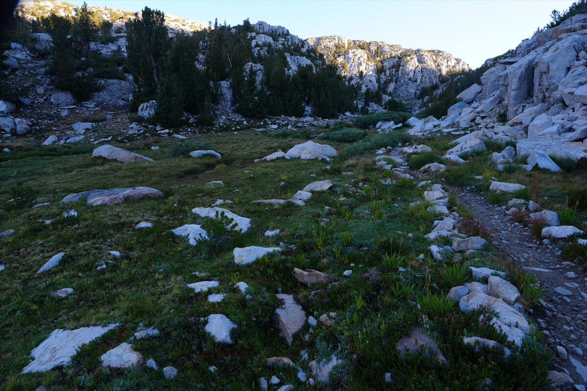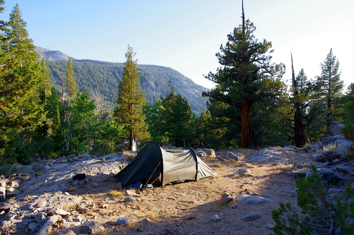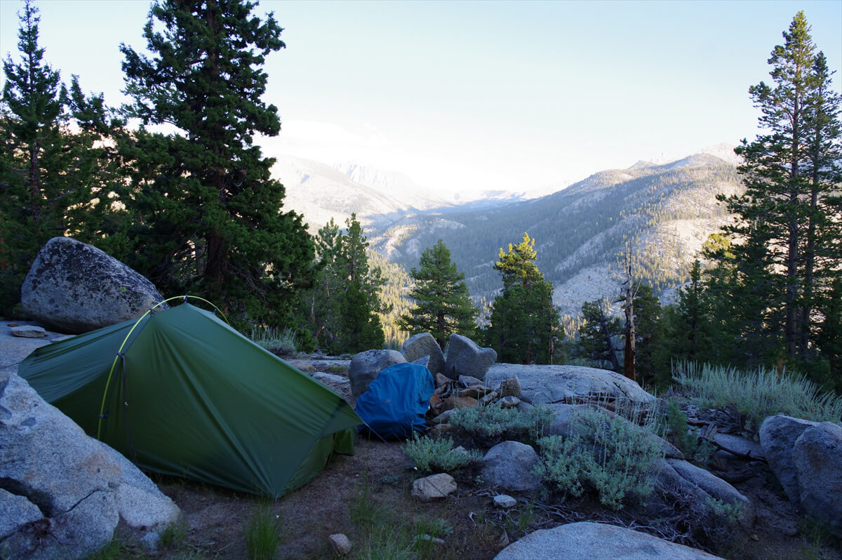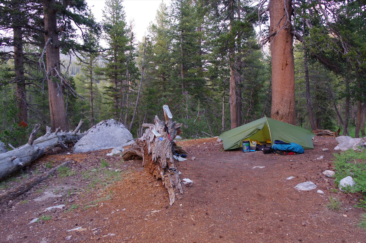 今年はマリー・レイクから流れ出る川の水は少なかった。岩の上を普通に歩いて渡った。しばらくはなだらかな下りだが、少しずつ勾配を増す。左手には川が見えて、少しずつ遠ざかる。最後のスイッチバックで高度を落とすと、メドウが見える。ローズマリー・メドウである。狭いメドウだが、水平な地形になるので、キャンプ・サイトが点在する。一番、よい場所はローズ・レイクに向かうトレイルとのジャンクション付近で、ちょっとした高台で奥まった場所である。少なくとも 2019 年と2023 年にテントを張った。2019 年のキャンプを図 11.20 に示す。洗濯物を干したり、この方が雰囲気があってよいだろう。