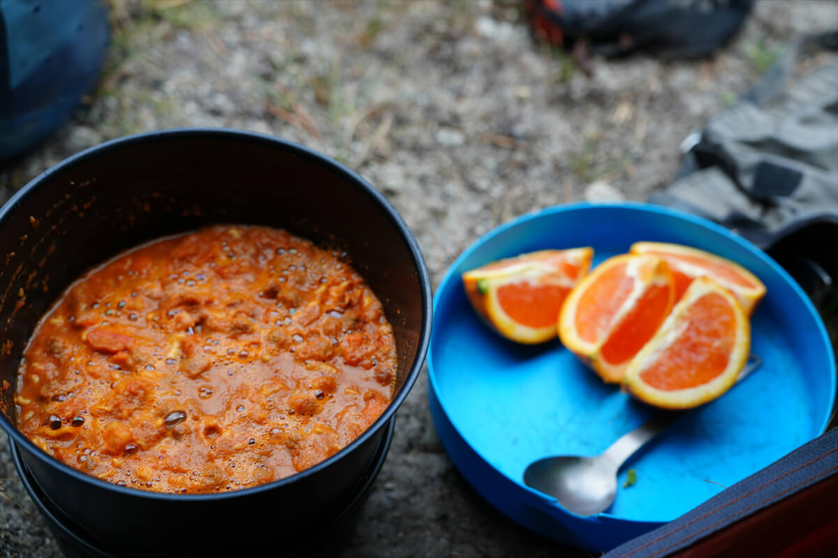 スイッチバックは長く、上の方に川に下りる急傾斜の踏み跡がある。そこを越えると傾斜は緩くなる。スイッチバックを終えるとメドウが現れ、平らになってくる。川を渡る前がキャンプ適地である。数回、テントを張った。図 11.5 は 2017 年に張った場所である。2023 年にも千恵子とここでテントを張った。川から少し離れているが、静かな広い場所である。センジャー・クリークを渡ると、狭いキャンプ・サイトはあるが、あまりに川が近いから止めた方がよい。ちょうど 12 時半だった。ランチとした。水を補給して浄水器を岩の上にブラダーをセットして、落下方式で自動的にきれいな水が得られるようにした。ランチを食べる間にきれいな水が得られる。ランチは MTR で作ったサンドイッチ (図 11.6) とインスタント・コーヒーである。