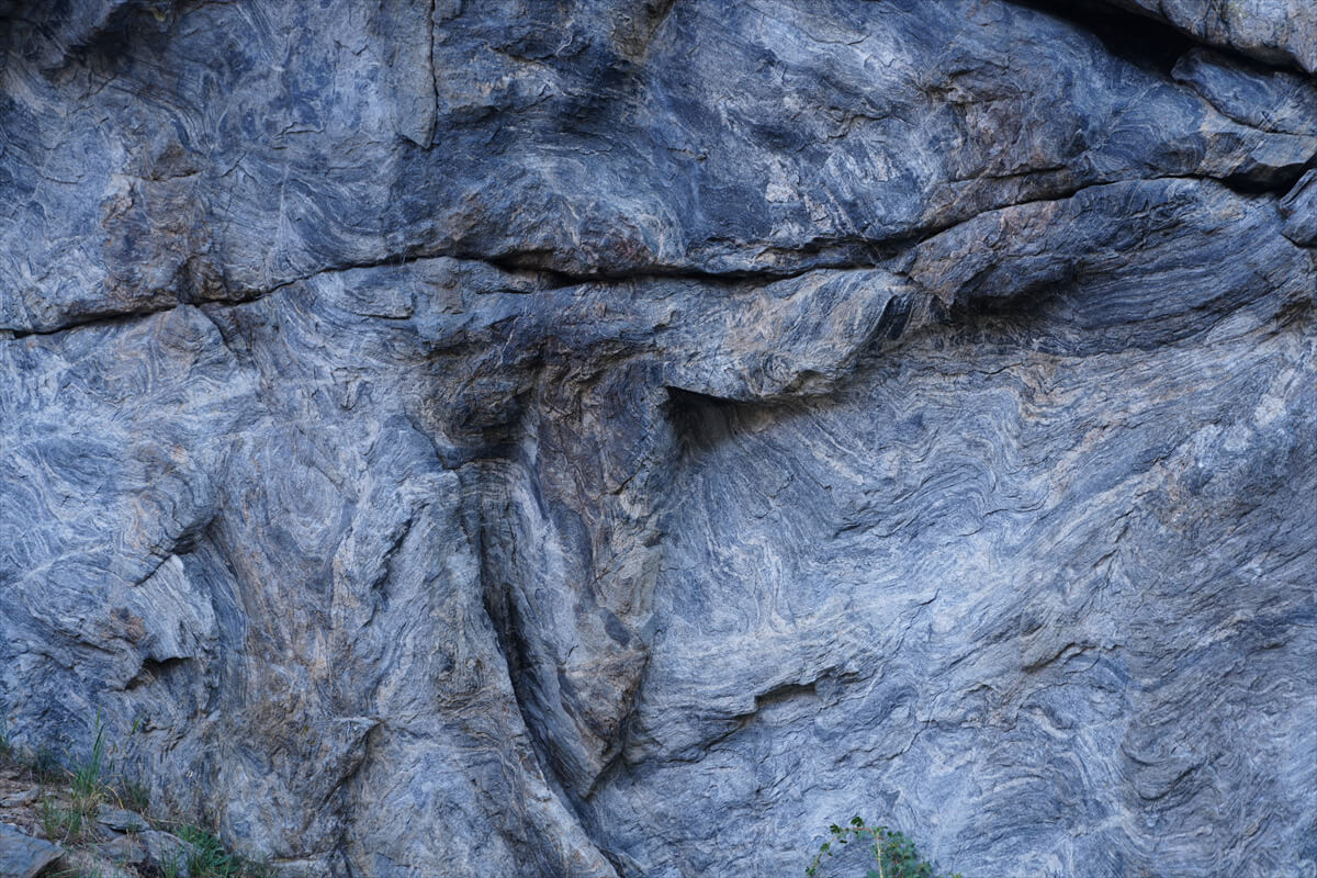 ハート・レイクを過ぎると、トレイルは緩やかな登りになり、図 11.14のようにセルデン・パスが見えてくれる。パスは右手の低い所で、最後はスイッチバックで詰めることになる。右手前方の岩肌は珍しく褶曲の模様が多い。ハイシェラは花崗岩が主体なので、この場所のように水成岩が見られる場所は少ない。JMT の名所ではペインテッド・レイディがそれである。なぜ、ここを詳しく知っているかと言えば、2009 年に会ったクレージー・ドックが熱心に撮影していたからである。