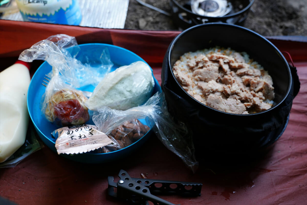 図 11.25 がテントを張った場所である。小川は 10m ほど離れているだけだった。少し傾斜はあるが、悪くはない。水を 5L 調達した。周りを調べると、テントを張れそうな場所も他にあった。希にテントを張る人もいるようだ。夕食は図 11.26 のように、MTR で入手したツナをご飯に乗せてメインとした。