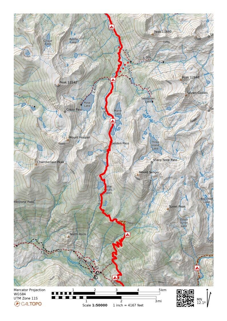 MTR から VVR は二日程度の距離である。MTR を出発してしばらくするとセリンジャー・クリークのスイッチバックがある。それで、午前中にこの登りをこなさないと午後からは背後から直射日光を浴びることになる。高度を上げれば、キャンプできる場所があちこちにある。サリー・キーズ・レイクスは休憩やキャンプによい場所である。その後はハートレイクからセルデン・パスを越える。パスからはマリー・レイクの絶景が見えるだろう。マリー・レイクを下ると、ローズマリー・メドウの辺りが緩やかである。ベア・クリークへは急なスイッチバックで下る。例年は膝程度の水深で、それなりの徒渉が必要な場所だが、今年は飛び石づたいに歩けたので、靴も濡らさなかった。