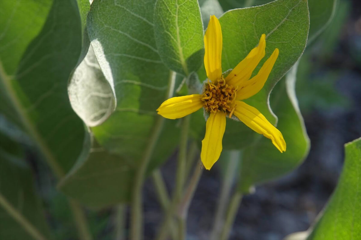 最初のスイッチバックの辺りには図 11.23 の群落がある。クレージー・ドックが熱心に撮影していたので、記憶に残っている。彼はロバの耳と言ったが、ワイエティア・モリスという花である。今年の花は終わっていたので、古い写真を示す。
