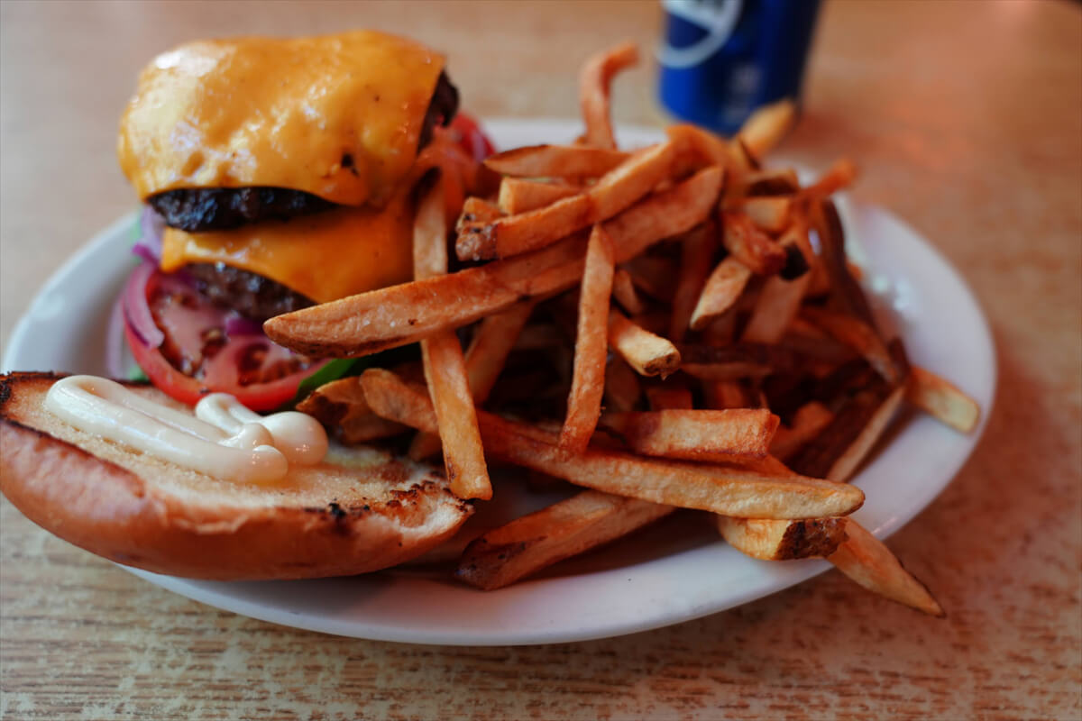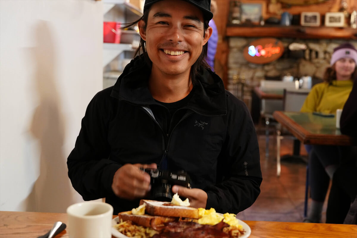 ランチは VVR のハンバーガー (図 12.6) である。ハイカー用なので、とりあえず、大きく、高カロリーである。これは意外に美味しかった。