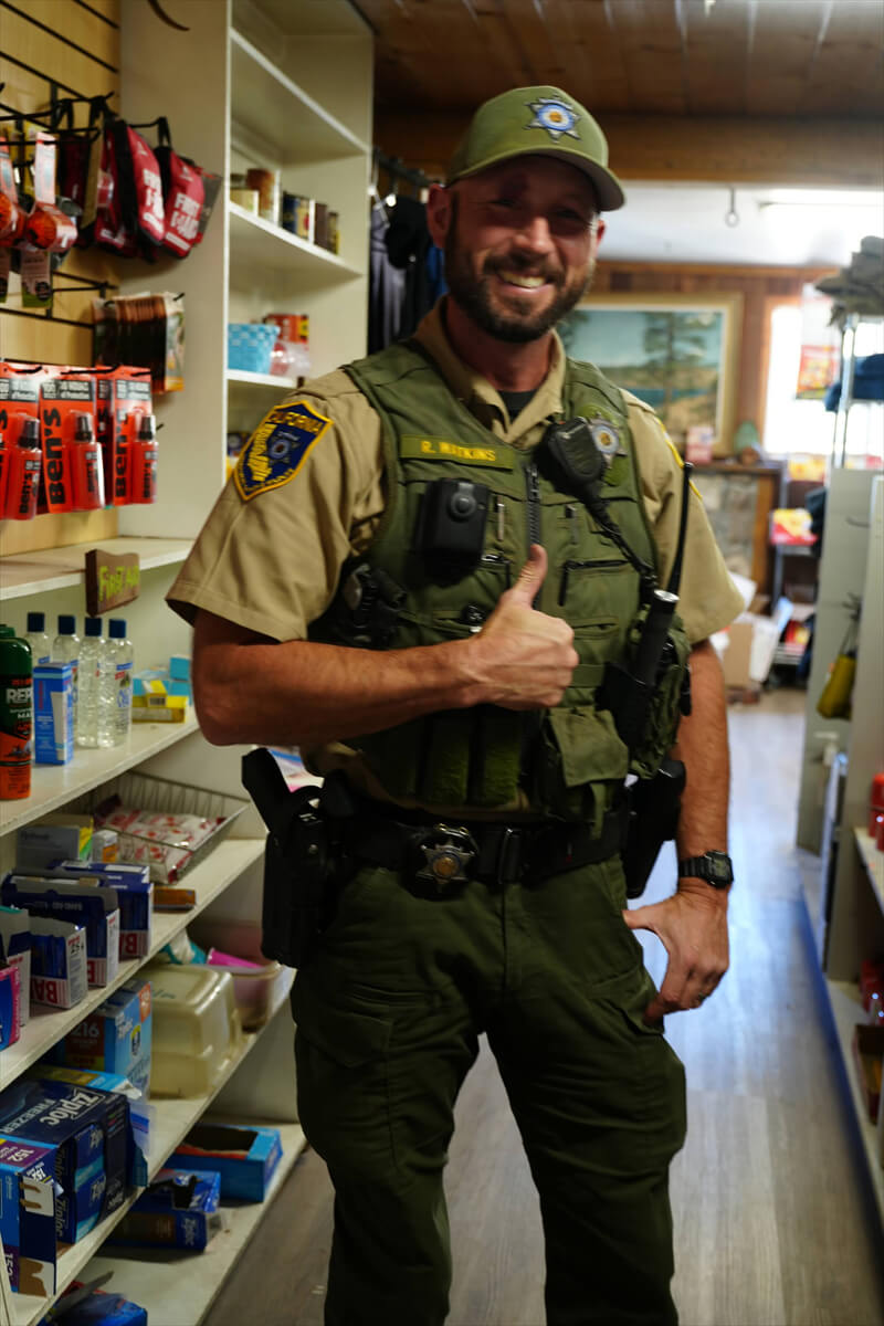 今年はちょっと変わった人を見かけた。フッシュ・ポリースと言っていた。釣り専門の警察官という。ちゃんと拳銃まで持っていてびっくりした。 VVR で見たのは初めてだった。しっかり記念撮影させてもらった。それが図 12.9 である。みなさん、なかなか愛嬌がよい。