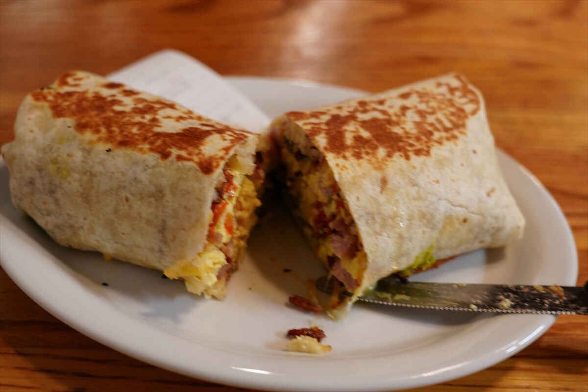 アメリカに来た時はパン・ケーキの朝食ばかり食べていたが、最近はブリトーばかりである。筆者の朝食を図 12.15 に示す。パンケーキなどの朝食は山崎さんの写真参照。ともかくカロリー重視で、パンケーキ、パン、油ぎとぎとのポテト、塩辛いカリカリベーコン、スクランブル・エッグなどが標準である。朝食を食べると昼食は不要になる。数日、滞在すると、二日目からは食べたくなくなる。三日目はもっともっと低カロリーな物を探すようになる。