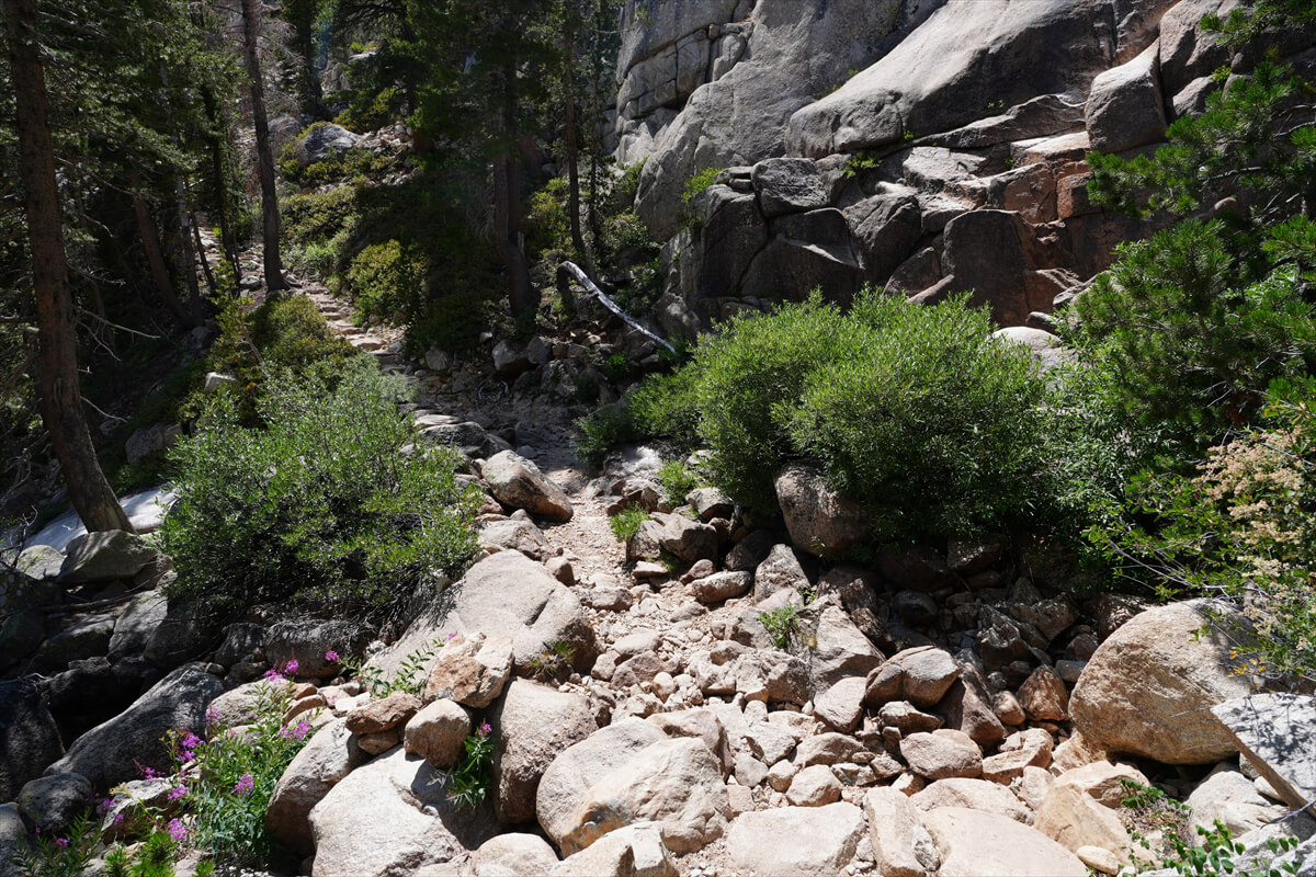まもなく、きつめのスイッチバックが始まる。ちょうど、ゴールデン・ステア・ケースの小規模版である。岩肌にきっちりとスイッチバックが刻まれる。モノ・クリークのもう一つの支流、シルバー・パス・クリークとも交差する、図 12.20 の場所で、例年は左上方から滝のように流水があるのだが、今年は完全に干上がっていた。