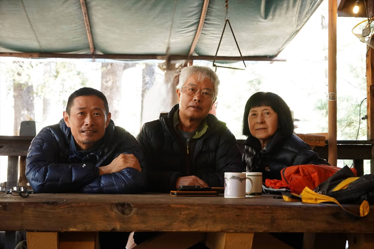 山崎優太 (図 12.16) はローカスギアのトレッキング・ポール、同社のピラミッド型タープと分かりやすかった。筆者は非社交的なので、日本人でもこちらから話しかけることは余りない。彼とは朝食の時にたまたま一緒になったので、記念撮影して、しばらく話をした。